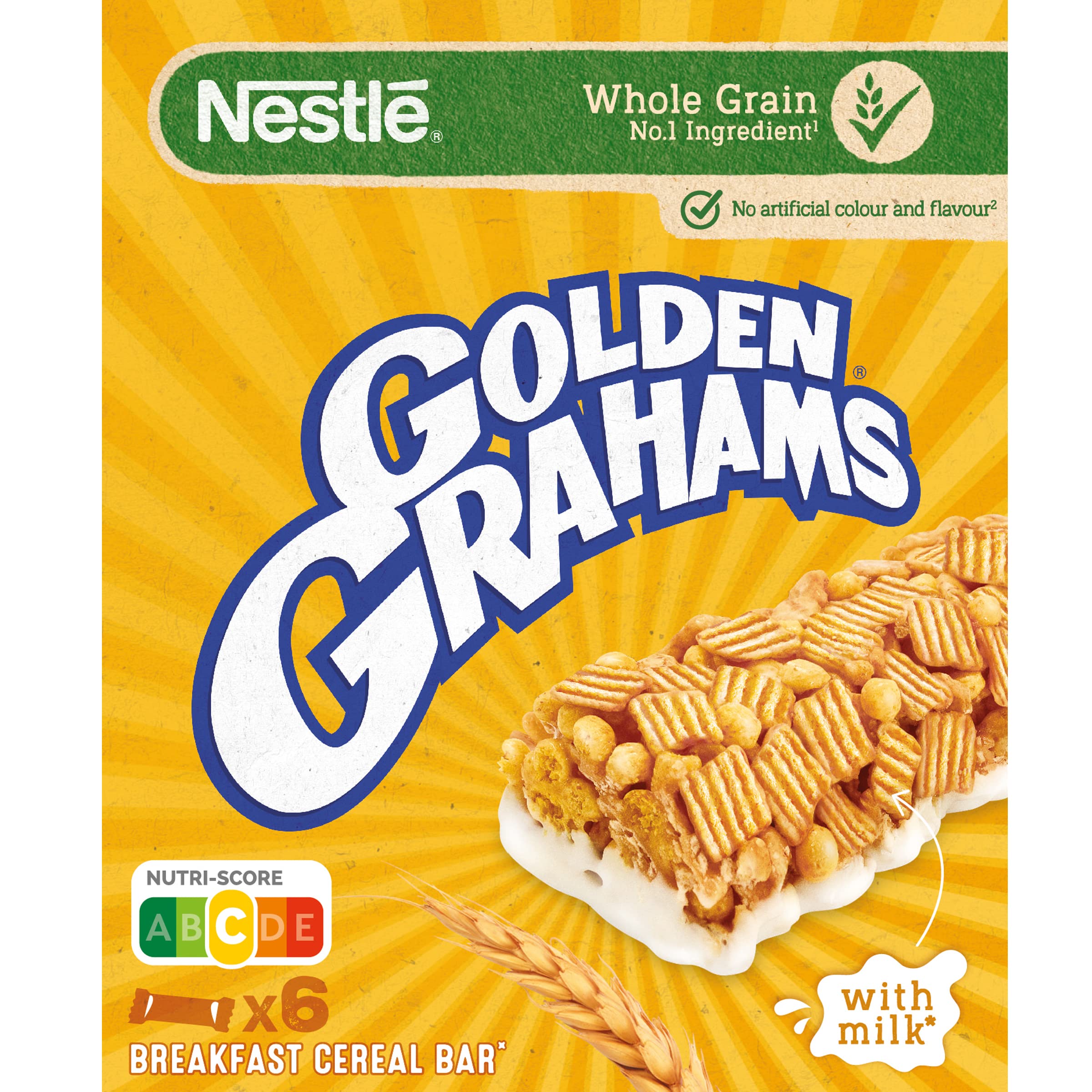 Discover the unique taste of GOLDEN GRAHAMS in these irresistibly biscuity cereal bars. GOLDEN MINIS, on-the-go bars with a delicious golden biscuit taste baked with milk. Cereal bars enriched with calcium and 5 vitamins and with natural flavours. GOLDEN MINIS, irresistibly biscuity! INGREDIENTS Cereals 30 (whole wheat 10.2 , corn semolina 10.1 , whole wheat flour 5.3 , whole corn flour 4.2 ), glucose syrup, vegetable oils (palm, sunflower), sugar, sweetened condensed milk 9 (milk, sugar), sugar, skimmed milk powder, invert sugar syrup, humectants (sorbitol, glycerol), maltodextrin, vitamins and minerals (calcium carbonate, niacin, pantothenic acid, folic acid, vit. B6, riboflavin (B2)), corn starch, dextrose, salt, raising agent (sodium carbonates), emulsifier (sunflower lecithin), molasses, barley malt extract, antioxidant (tocopherol-rich extract), natural flavorings, acidity regulator (sodium phosphates), color (carotenoids). May contain soy, almonds and other nuts.For a delicious break. Enriched with 7 vitamins, calcium, and iron. Delicious GOLDEN GRAHAMS cereal with honey flavor and milk in a takeaway bar. Retrouvez le goût unique de GOLDEN GRAHAMS dans ces barres de céréales irrésistiblement biscuitées. GOLDEN MINIS, des barres à emporter au délicieux goût de biscuit doré au four avec du lait. Barres de céréales enrichies en calcium et 5 vitamines et avec des arômes naturels. GOLDEN MINIS, irrésistiblement biscuité ! INGRÉDIENTS Céréales 30 (BLE complet 10,2 , semoule de maïs 10,1 , farine de BLE complet 5,3 , farine de maïs complet 4,2 ), sirop de glucose, huiles végétales (palme, tournesol), sucre, LAIT concentré sucré 9 (LAIT, sucre), sucre, LAIT écrémé en poudre, sirop de sucre inverti, humectants (sorbitol, glycérol), maltodextrine, vitamines et minéraux (carbonate de calcium, niacine, acide pantothénique, acide folique, vit. B6, riboflavine (B2)), amidon de maïs, dextrose, sel, poudre à lever (carbonates de sodium), émulsifiant (lécithine de tournesol), mélasse, extrait de malt D'ORGE, antioxydant (extrait riche en tocophérols), arômes naturels, correcteur d'acidité (phosphates de sodium), colorant (caroténoïdes). Peut contenir du soja, des amandes et autres fruits à coque.Pour une pause gourmande. Enrichie en 7 vitamines, calcium et fer. Les délicieuses céréales GOLDEN GRAHAMS au goût de miel avec du lait dans une barre à emporter.