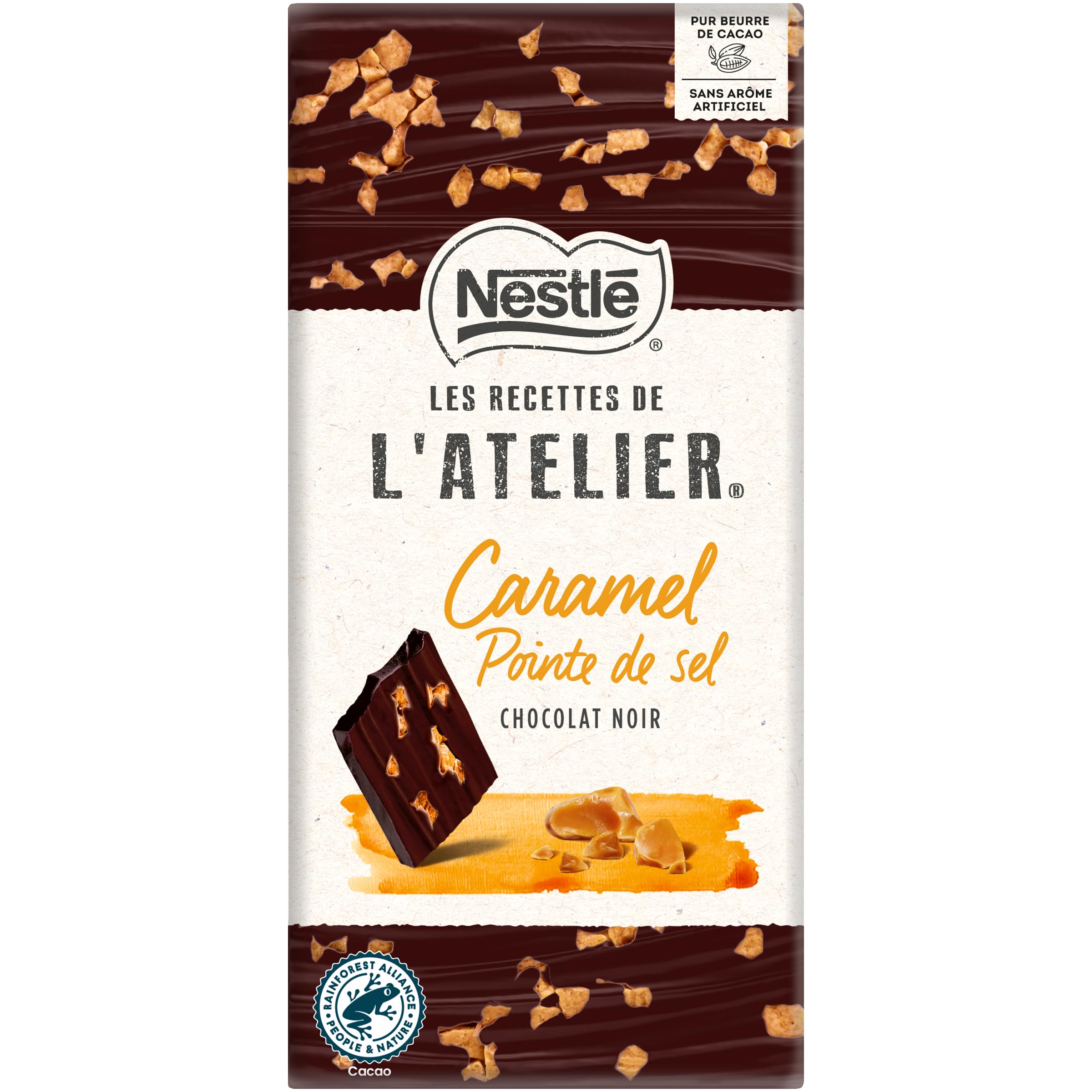 Discover our new recipe with even more intense caramel! Let yourself be tempted by a dark chocolate bar as fine as it is delicious, enhanced by fine, crispy caramel chips with a hint of salt. A delicious pure cocoa butter chocolate with no artificial flavoring. And since there is no great chocolate without great cocoa, our cocoa beans are carefully selected and sourced from Rainforest Alliance certified plantations. More intense caramel flavor. INGREDIENTS Ingredients: Cocoa mass (West Africa, Ecuador), sugar, salted caramel chips (10 ) (sugar, CREAM powder, whole MILK powder, salt, cocoa butter, WHEY powder, natural vanilla flavoring), anhydrous MILK fat, cocoa butter, emulsifier (lecithins), natural flavoring, natural Madagascar vanilla flavoring. Cocoa: 54 minimum in dark chocolate. May contain: EGG, GLUTEN, NUTS.Nestlé partners with the Rainforest Alliance to support cocoa farmers. Cocoa beans carefully selected as part of the Nestlé Cocoa Plan. There's no great chocolate without great cocoa our cocoa beans are carefully selected and sourced from Rainforest Alliance-certified plantations. 100 pure cocoa butter, intense cocoa (54 ), certified cocoa beans. Treat yourself to a dark chocolate bar as fine as it is delicious, enhanced by fine, crispy caramel pieces with a hint of salt. Discover our new recipe, even more caramel-intensive! Découvrez notre nouvelle recette encore plus intense en caramel ! Laissez-vous tenter par une tablette de chocolat noir aussi fine que gourmande et sublimée par de fins et croustillants éclats de caramel à la pointe de sel. Un délicieux chocolat pur beurre de cacao et sans arôme artificiel. Et comme il n'y a pas de grand chocolat sans grand cacao, nos fèves de cacao sont soigneusement sélectionnées et issues de plantations certifiées Rainforest Alliance. Saveur caramel plus intense. INGRÉDIENTS Ingrédients: Pâte de cacao (Afrique de l'Ouest, Equateur), sucre, éclats de caramel salé (10 ) (sucre, CREME en poudre, LAIT entier en poudre, sel, beurre de cacao, PETIT-LAIT en poudre, arôme naturel de vanille), matière grasse de LAIT anhydre, beurre de cacao, émulsifiant (lécithines), arôme naturel, arôme naturel de vanille Madagascar. Cacao : 54 minimum dans le chocolat noir. Peut contenir : OEUF, GLUTEN, FRUITS A COQUE.Nestlé s'engage avec Rainforest Alliance pour soutenir les cultivateurs de cacao. Fèves de cacao soigneusement sélectionnées dans le cadre du Plan Cacao Nestlé. Il n'y a pas de grand chocolat sans grand cacao, nos fèves de cacao sont soigneusement sélectionnées et issues de plantations certifiées Rainforest Alliance. 100 pur beurre de cacao, intense en cacao (54 ), fèves de cacao certifiées. Laissez-vous tenter par une tablette de chocolat noir aussi fine que gourmande et sublimée par de fins et croustillants éclats de caramel à la pointe de sel. Découvrez notre nouvelle recette encore plus intense en caramel !.