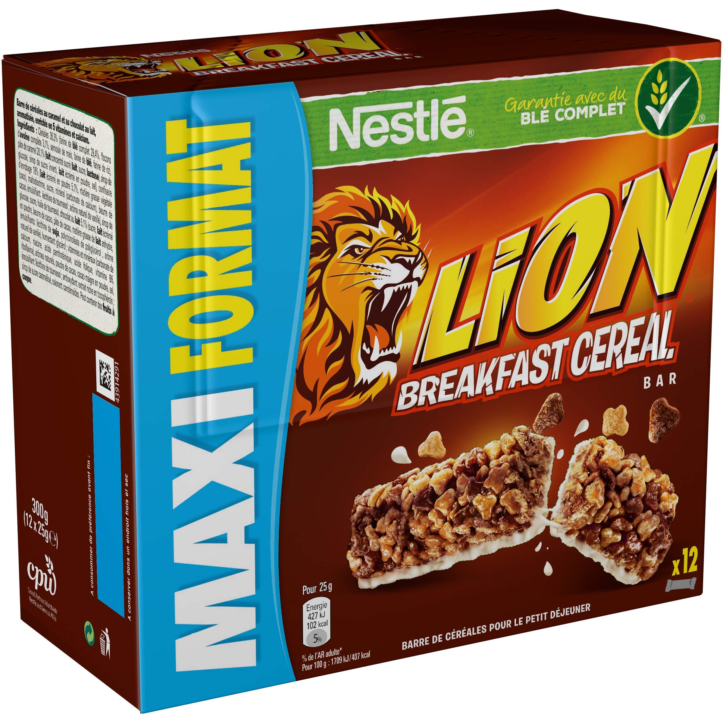 Find the unique taste of chocolate and lion's caramel now in a delicious and crunchy cereal bar to take anywhere with you. For a complete breakfast, enjoy your cereal bar with a dairy product and a fruit (1 of the 5 recommended servings per day). INGREDIENTS Ingredients: Cereals 36.3 (whole WHEAT flour 29.4 , whole OAT flakes 3.1 , corn meal, WHEAT flour, rice flour), caramel paste 20.1 [sweetened condensed MILK (MILK, sugar, LACTOSE), glucose syrup, invert sugar syrup, skimmed MILK powder, salt], coating confectionery 18 [Skimmed MILK powder 5.1 , vegetable fat (coconut), maltodextrin, sugar, mineral (calcium carbonate), cocoa butter, emulsifier: sunflower lecithin natural vanilla flavor], glucose syrup, sugar, sunflower oil, milk chocolate 5.1 (sugar, skimmed milk powder, cocoa butter, cocoa mass, anhydrous MILK fat, emulsifiers: SOYA lecithin, polyglycerol polyricinoleate natural vanilla flavor), humectant: glycerol vitamins and minerals (calcium carbonate, niacin, panthotenic acid, folic acid, vitamin B6, riboflavin), natural flavors, cocoa powder, low-fat cocoa powder, salt, emulsifier: sunflower lecithin antioxidant: extract rich in tocopherols caramelized sugar syrup, coloring: carotenoids. May contain NUTS. DIRECTIONS FOR USE SAFETY WARNING Source of vitamins and minerals. Take it anywhere. 1st ingredient: Whole wheat. Retrouvez Le Goût Unique Du Chocolat Et Du Caramel De Lion Maintenant Dans Une Délicieuse Et Croustillante Barre De Céréales À Emporter Partout Avec Soi. Pour Un Petit-Déjeuner Complet, Savourez Votre Barre De Céréales En L'Accompagnant D'Un Produit Laitier Et Un Fruit ( 1 Des 5 Portions Recommandées Par Jour). INGRÉDIENTS Ingrédients : Céréales 36,3 (farine de BLE complet 29,4 , flocons d'AVOINE complète 3,1 , semoule de maïs, farine de BLE, farine de riz), pâte de caramel 20,1 [LAIT concentré sucré (LAIT, sucre, LACTOSE), sirop de glucose, sirop de sucre inverti, LAIT écrémé en poudre, sel], confiserie d'enrobage 18 [LAIT écrémé en poudre 5,1 , matière grasse végétale (coco), maltodextrine, sucre, minéral (carbonate de calcium), beurre de cacao, émulsifiant: lécithine de tournesol arôme naturel de vanille], sirop de glucose, sucre, huile de tournesol, chocolat au lait 5,1 (sucre, lait écrémé en poudre, beurre de cacao, pâte de cacao, matière grasse de LAIT anhydre, émulsifiants: lécithine de SOJA, polyricinoléate de polyglycérol arôme naturel de vanille), humectant: glycérol vitamines et minéraux (carbonate de calcium, niacine, acide panthoténique, acide folique, vitamine B6, riboflavine), arômes naturels, poudre de cacao, cacao maigre en poudre, sel, émulsifiant: lécithine de tournesol antioxydant: extrait riche en tocophérols sirop de sucre caramélisé, colorant: caroténoïdes. Peut contenir des FRUITS A COQUE. MODE D'EMPLOI AVERTISSEMENT DE SÛRETÉ Source de vitamines et de minéraux. À emporter partout. 1er ingrédient : Blé complet.
