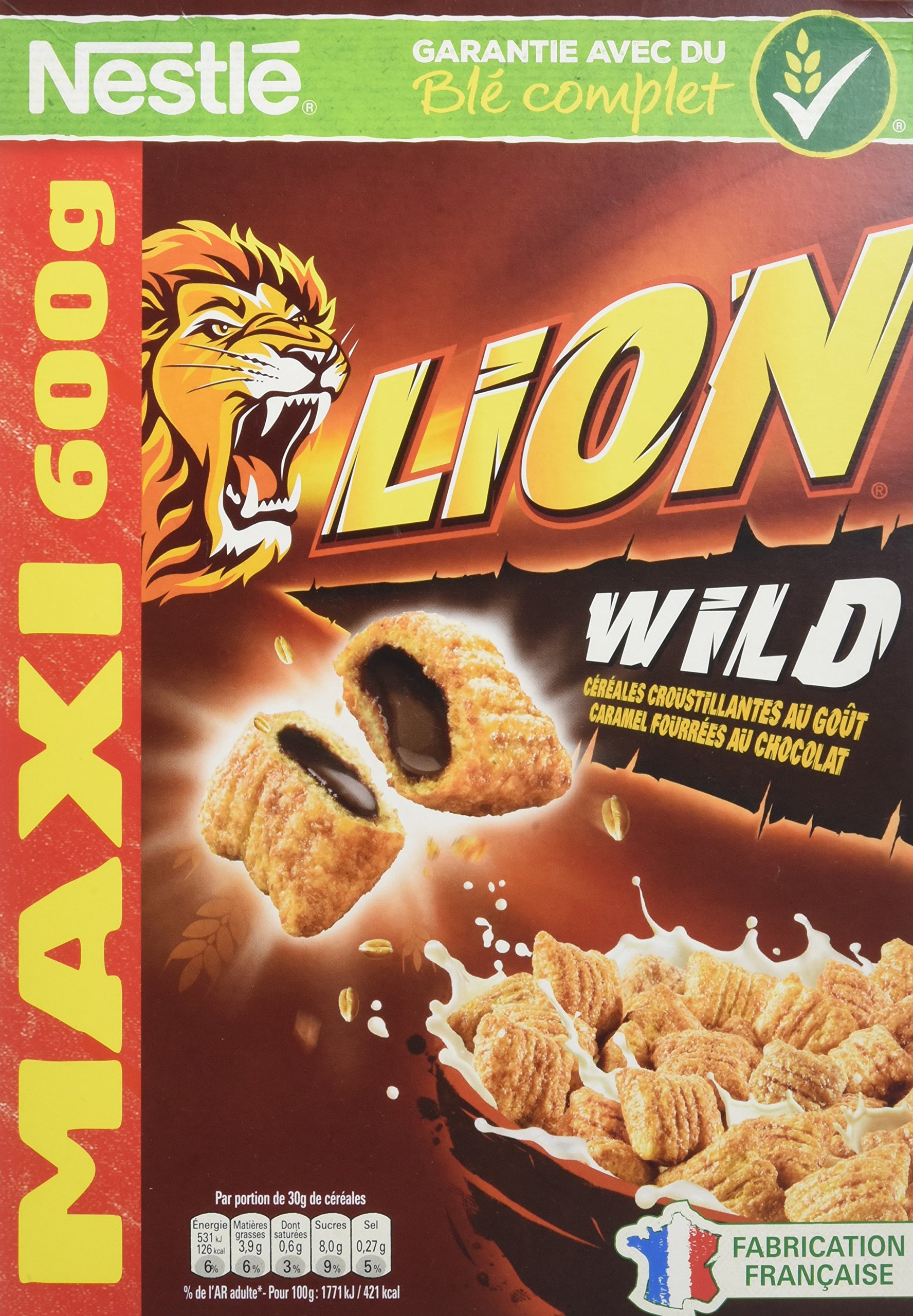 LION WILD, discover an indomitable chocolate in a crispy shell with a caramel flavor. Enriched with 7 vitamins, Calcium and Iron INGREDIENTS Ingredients: Cereals 47.3 (complete WHEAT 27 , rice flour, cornmeal), fodder 35.5 (vegetable oils (palm, rapeseed), sugar, chocolate 5.9 (low-fat cocoa powder, sugar, cocoa butter), maltodextrin, caramel powder 2.1 (sugar, skimmed MILK powder), skimmed MILK powder, mineral: calcium carbonate WHEY powder (MILK), emulsifier: sunflower lecithin flavors, antioxidant: extract rich in tocopherols salt), sugar, glucose syrup, vitamins and minerals (niacin, pantothenic acid, vitamin B6, vitamin B2, folic acid, calcium carbonate and iron), salt, emulsifier: sunflower lecithin palm oil, caramelized sugar syrup, flavorings, low-fat cocoa powder, acidity regulator: trisodium phosphate coloring: beta-carotene antioxidant: extract rich in tocopherols. May contain peanuts and other tree nuts. DIRECTIONS FOR USE For a complete breakfast, accompany your cereals with 125ml of semi-skimmed milk and a fresh fruit SAFETY WARNING None LION WILD, unleash the wild spirit! Whole wheat, the first ingredient in LION WILD cereal. Crispy caramel-flavored cereal filled with chocolate. LION WILD, découvrez un chocolat indomptable dans une coque croustillante au goût de caramel. Enrichies en 7 vitamines, Calcium et Fer INGRÉDIENTS Ingrédients: Céréales 47,3 (BLE complet 27 , farine de riz, semoule de maïs), fourrage 35,5 (huiles végétales (palme, colza), sucre, chocolat 5,9 (cacao maigre en poudre, sucre, beurre de cacao), maltodextrine, caramel en poudre 2,1 (sucre, LAIT écrémé en poudre), LAIT écrémé en poudre, minéral : carbonate de calcium LACTOSERUM en poudre (LAIT), émulsifiant : lécithine de tournesol arômes, antioxydant : extrait riche en tocophérols sel), sucre, sirop de glucose, vitamines et minéraux (niacine, acide pantothénique, vitamine B6, vitamine B2, acide folique, carbonate de calcium et fer), sel, émulsifiant : lécithine de tournesol huile de palme, sirop de sucre caramélisé, arômes, cacao maigre en poudre, correcteur d'acidité : phosphate trisodique colorant : bêta-carotène antioxydant : extrait riche en tocophérols. Peut contenir des arachides et d'autres fruits à coque. MODE D'EMPLOI Pour un petit déjeuner complet , accompagnez vos céréales de 125ml de lait demi-écrémé et d'un fruit frais AVERTISSEMENT DE SÛRETÉ Aucun LION WILD, libère l'esprit sauvage !. Le blé complet, 1er ingrédient des céréales LION WILD. ?Céréales croustillantes au goût caramel fourrées au chocolat.