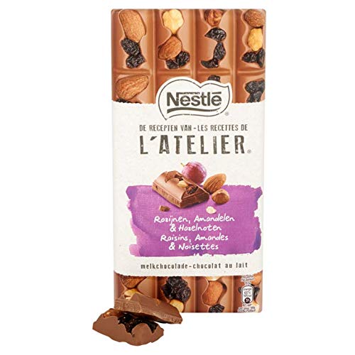 DESCRIPTION DU PRODUIT DESCRIPTION DU PRODUIT Nestle L'ATELIER Chocolat au lait entier avec raisins, noisettes et amandes 195 g MODE D'EMPLOI Idéal pour accompagner le café