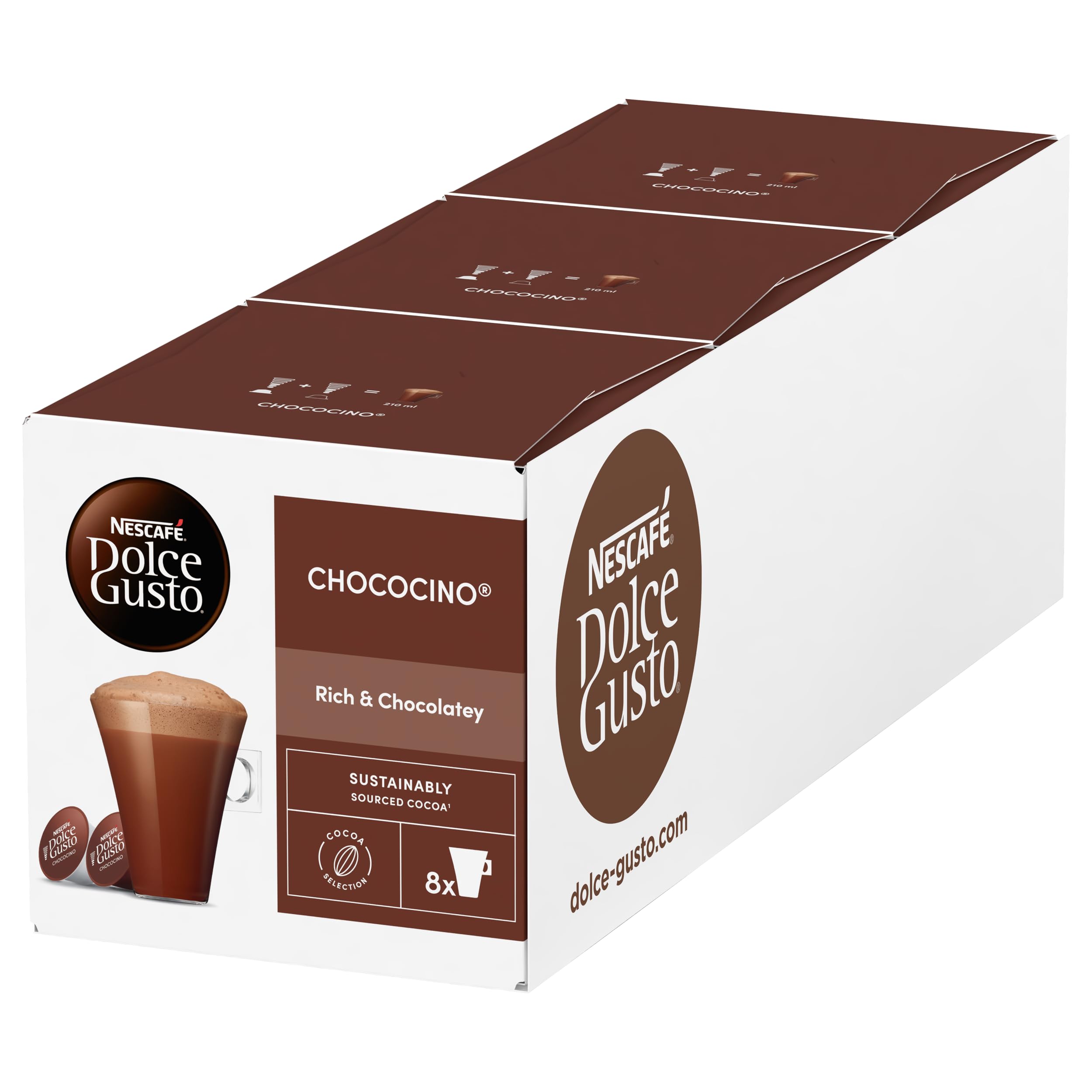 Immerse yourself in a chocolate drink with a wonderfully dense cream and be surprised by the intensity of the Nescafé Dolce Gusto Chococino drink. Chococino is enveloping, generous and creamy, it is impossible not to love it. Is chococino coffee? No, chococino is not coffee, it is a dense, frothy chocolate drink made with milk and a hint of sweet vanilla. We don't all have to stop loving tasty chocolate after forty years. When the family undoubtedly gathers around their own mug of happiness, you can share the warmth and enjoy sweet fun together at any time of the day. Is there caffeine in hot chocolate? Generally not. And that also applies to Chococino. With sweet notes of vanilla, you can enjoy this caffeine-free hot drink at the touch of a button. INGREDIENTS Milk capsule: milk powder (89.7 ), sugar (10.1 ), emulsifier (soy lecticin). Chocolate capsule: chocolate powder (98.7 ) (sugar, cocoa), emulsifier (soy lecticin), natural flavouring, cinnamon. May contain milk. Cocoa: minimum 32 chocolate powder. SAFETY WARNING May contain allergens (milk, soy). Not suitable for children under 3 years. Only use with NESCAFÉ Dolce Gusto machines. Do not swallow capsules. See moreNescafé DOLCE GUSTO Cacao chocolade verpakking van 3 x 16 capsules in totaal: 48 capsules Dompel jezelf onder in een chocoladedrank met een heerlijk dichte crème en laat je verrassen door de intensiteit van de Nescafé Dolce Gusto Chococino-drank. Chococino is omhullend, genereus en romig, het is onmogelijk om er niet van te houden. Is chococino koffie? Nee, chococino is geen koffie, het is een dichte, schuimige chocoladedrank gemaakt met melk en een vleugje zoete vanille. We hoeven niet allemaal te stoppen met het houden van smakelijke chocolade na veertig jaar. Als het gezin ongetwijfeld samenkomt rond hun eigen mok geluk, kun je op elk moment van de dag de warmte delen en samen genieten van zoet plezier. Zit er cafeïne in warme chocolademelk? Over het algemeen niet. En dat geldt ook voor Chococino. Met zoete tonen van vanille kun je met één druk op de knop van deze cafeïnevrije warme drank genieten. INGREDIËNTEN Melkcapsule: melkpoeder (89,7 ), suiker (10,1 ), emulgator (sojalecticine). Chocoladecapsule: chocoladepoeder (98,7 ) (suiker, cacao), emulgator (sojalecticine), natuurlijk aroma, kaneel. Kan melk bevatten. Cacao: minimaal 32 chocoladepoeder. VEILIGHEIDSWAARSCHUWING Kan allergenen bevatten (melk, soja). Niet geschikt voor kinderen onder de 3 jaar. Alleen gebruiken met NESCAFÉ Dolce Gusto machines. Slik geen capsules in. Meer bekijken