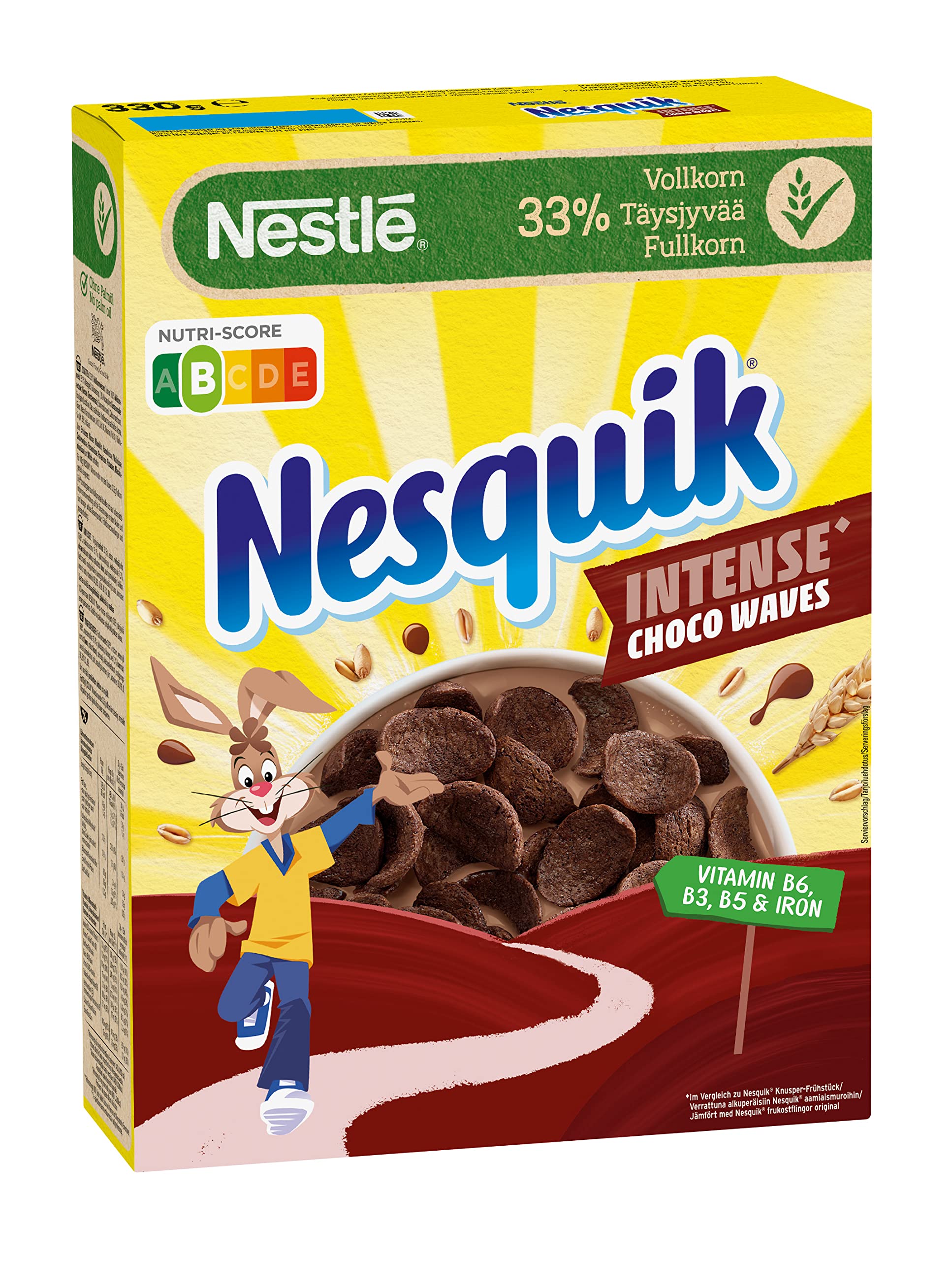 Nestlé Nesquik Choco Waves The usual tasty Nesquik breakfast cereals can now be enjoyed in a completely new form, as delicious chocolate waves. The extra crunchy texture and the even more intensive chocolate taste ensure a good start to the day. as a Nesquik crispy breakfast. Whole grains as ingredient no. 1 - for a delicious breakfast every day. For whole grains as the main ingredient, the whole grain is used. This way, a large part of the valuable nutrients remains included. With important vitamins (B6, B3, B5) and minerals (calcium, iron). The iron present in the product contributes to the normal cognitive development of children. Vitamin B6 and niacin (vitamin B3) contribute to normal psychological function and panthenic acid (vitamin B5) contributes to normal mental performance. Nestlé Nesquik Choco Waves • 33 whole wheat • Nutri Score: B • Nesquik in a new wave form and an even more intensive chocolate flavor (as Nesquik crispy breakfast). • With natural aromas • Provides vitamins and minerals such as iron, vitamin B6, niacin and pantothenic acid. Nesquik Choco Waves achieves the Nutri Score B. The Nutri-Score is a five-level letter scale, which is also printed in colors and printed as nutritional value on the front of the product. In addition to the energy content, the underlying algorithm assesses "less positive" nutrients such as sugar, saturated fatty acids and sodium (salt) and "positive" ingredients fiber, proteins and the content of fruit, vegetables, nuts and selected oils per 100 grams. INGREDIENTS Ingredients: 33.5 whole wheat, sugar, 16.8 wheat flour, 15.1 corn grits, glucose syrup, 7.3 cocoa powder, barley malt extract (barley, barley malt), sunflower oil, calcium carbonate, emulsifier (lecithinin salt, natural vanilla flavouring, natural flavouring, iron, niacin, pantothenic acid, vit. D, vit. B6, thiamine (vit. B1), Riboflavin (Vit. B2), folic acid. May contain earthens, nuts (almonds, hazelnuts, walnuts, cashew nuts, pecan nuts, Brazil nuts, pistachio, macadamia nuts) and milk.Nestlé Nesquik Choco Waves, chocolade knapperig ontbijt in golfvorm (33 volkorengehalte), 1 verpakking (1 x 330g) Nestlé Nesquik Choco Waves De gebruikelijke lekkere Nesquik ontbijtgranen kun je nu in een geheel nieuwe vorm genieten, als heerlijke chocoladegolven. De extra knapperige textuur en de nog intensievere chocoladesmaak zorgen voor een goede start van de dag. als Nesquik knapperontbijt. Volkorengranen als ingrediënt nr. 1 - voor een heerlijk ontbijt, elke dag. Voor volkorengranen als hoofdingrediënt wordt de hele korrel gebruikt. Zo blijft een groot deel van de waardevolle voedingsstoffen inbegrepen. Met belangrijke vitaminen (B6, B3, B5) en mineralen (calcium, ijzer). Het in het product aanwezige ijzer draagt bij aan de normale cognitieve ontwikkeling van kinderen. Vitamine B6 en niacine (vitamine B3) dragen bij aan de normale psychische functie en pantheenzuur (vitamine B5) draagt bij aan een normale mentale prestaties. Nestlé Nesquik Choco Waves • 33 volkorentarwe • Nutri-Score: B • Nesquik in een nieuwe golfvorm en een nog intensievere chocoladesmaak (als Nesquik knapperontbijt). • Met natuurlijke aroma's • Levert vitaminen en mineralen zoals ijzer, vitamine B6, niacine en pantotheenzuur. Nesquik Choco Waves bereikt de Nutri Score B. De Nutri-Score is een vijftraps letterschaal, die bovendien met kleuren is afgedrukt en als voedingswaarde op de voorkant van het product wordt afgedrukt. Het daarachter liggende algoritme beoordeelt naast het energiegehalte "minder positieve" voedingsstoffen zoals suiker, verzadigde vetzuren en natrium (zout) en "positieve" ingrediënten vezels, eiwitten en het gehalte aan fruit, groenten, noten en geselecteerde oliën per 100 gram. INGREDIËNTEN Ingrediënten: 33,5 volkorentarwe, suiker, 16,8 tarwemeel, 15,1 maïsgries, glucosestroop, 7,3 cacaopoeder, gerstemalextract (gerst, gerstemal), zonnebloemolie, calciumcarbonaat, emulgator (lecithinine zout, natuurlijke vanille aroma, natuurlijk aroma, ijzer, niacine, pantotheenzuur, vit. D, vit. B6, thiamine (vit. B1), Riboflavine (Vit. B2), foliumzuur. Kan aardinten, noten (amandelen, hazelnoten, walnoten, casheijnnoten, pecannoten, paranoten, pistache, macadamia-noten) en melk bevatten.