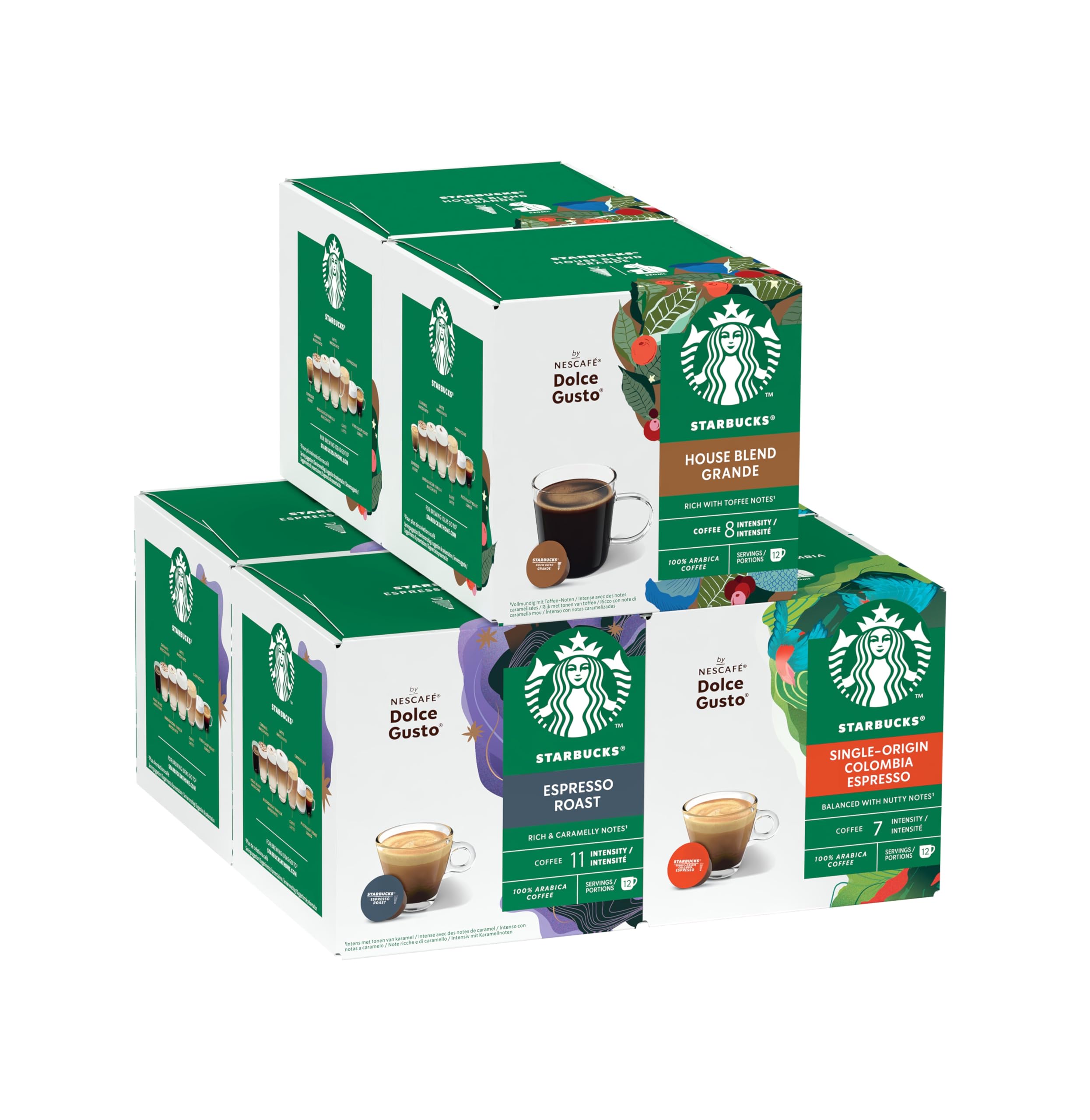 Experience the rich flavors of Starbucks coffee at home with Nescafé Dolce Gusto capsules. This exclusive trial package contains a selection of Starbucks black coffees, with various blends and roasts so that there is something for everyone. Designed for convenience, these coffee cups are compatible with Nescafé Dolce Gusto coffee machines, making it easy to brew café-quality drinks at the touch of a button. INSTRUCTIONS FOR USE: Place a capsule in the machine, close the lid and select the correct setting to make the coffee. INGREDIENTS Coffee SAFETY WARNING Consume in moderation. Contains caffeine. MANUFACTURER CONTACT INFORMATION Nestlé UK PO Box 207, York, YO91 1XY, UK 08007076066 See moreSTARBUCKS Zwarte Koffie Probeerpakket by Nescafé Dolce Gusto, Koffiecapsules 6 x 12 (72 Capsules) - Exclusief op Black Cup Variety Pack (House Blend) Ervaar de rijke smaken van Starbucks-koffie voor thuis met Nescafé Dolce Gusto-capsules. Dit exclusieve probeerpakket bevat een selectie van Starbucks zwarte koffies, met een diverse blends en brandingen zodat er voor iedereen wel iets tussen zit. Ontworpen voor gemak, zijn deze koffiecups compatibel met Nescafé Dolce Gusto koffiemachines, waardoor het eenvoudig is om café-kwaliteit dranken te zetten met maar één druk op de knop. GEBRUIKSAANWIJZING: Plaats een capsule in de machine, sluit het deksel en kies de juiste instelling om de koffie te zetten. INGREDIËNTEN Koffie VEILIGHEIDSWAARSCHUWING Met mate consumeren. Bevat cafeïne. CONTACTINFORMATIE FABRIKANT Nestlé UK PO Box 207, York, YO91 1XY, UK 08007076066 Meer bekijken