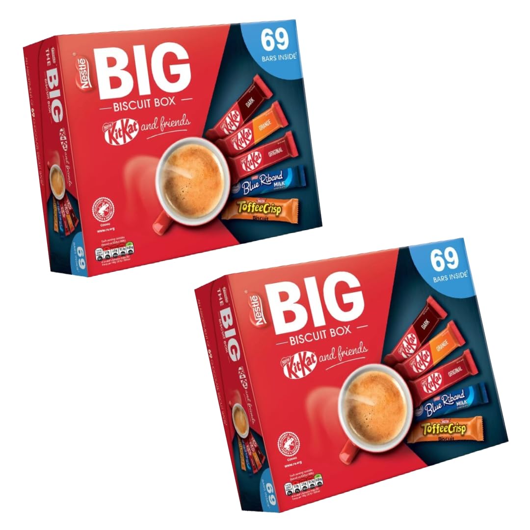 A presentation box with five delicious chocolate biscuits includes an assortment of KITKAT, BREAKAWAY, BLUE RIBAND, CARBON CRISP and YORKIE BISCUIT chocolate biscuit bars Suitable for use at any catering or office event No artificial colours, flavours, preservatives or hydrogenated fats and suitable for vegetarians (pack of 2)Suitable for vegetarians. No artificial colors, flavors, preservatives, or hydrogenated fats. Suitable for use at any catering or office event. Includes 18 KITKAT, 16 BREAKAWAY, 16 BLUE RIBAND, 14 CRISP, and 7 YORKIE. A presentation box with five delicious chocolate biscuits. Une boîte de présentation avec cinq délicieux biscuits au chocolat comprend un assortiment de barres à biscuits au chocolat KITKAT, BREAKAWAY, BLUE RIBAND, CARBONE CRISP et YORKIE BISCUIT Convient pour une utilisation à tout événement de restauration ou de bureau Sans colorants artificiels, saveurs, conservateurs ou graisses hydrogénées et convient aux végétariens (lot de 2)Convient aux végétariens. Sans colorants artificiels, arômes, conservateurs ni graisses hydrogénées. Convient pour une utilisation à tout événement de restauration ou de bureau. Comprend 18 x KITKAT, 16 x BREAKAWAY, 16 x BLUE RIBAND, 14 x CRISP et 7 x YORKIE. Une boîte de présentation avec cinq délicieux biscuits au chocolat.