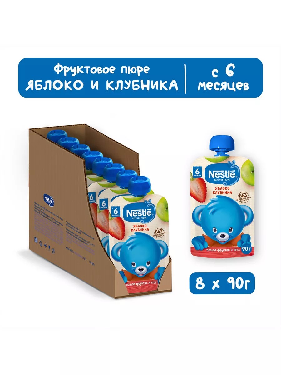 Nestle baby fruit puree "Apple and Strawberry" for children from 6 months in accordance with the legislation of the Russian Federation.