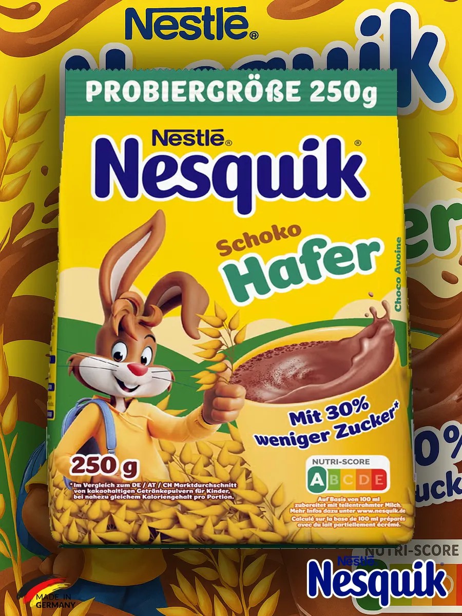 Try the healthy new product from Nestlé — Nesquik Schoko Hafer (Chocolate + Oats), an enriched milk drink mix with 30% less sugar. This product is designed with the nutrition of children and adults in mind, combining the taste of cocoa with the benefits of oats and natural ingredients.