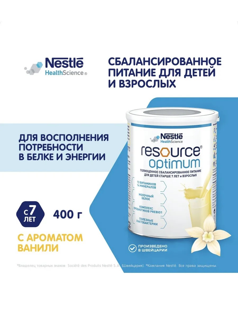 Ресурс оптимум смесь для детей старше 7 лет и взрослых - сухая смесь для приготовления коктейля с приятным ванильным вкусом. Содержит все необходимые вещества для улучшения пищеварения, восстановления сил при стрессе и укрепления иммунитета. Используется для коррекции нарушений питания при острых и хронических заболеваниях, серьезных нагрузках, стрессе и переутомлении. Рекомендован для питания пожилых людей, чей организм часто нуждается в особенной поддержке питанием. В состав входят пребиотики и пробиотики, Омега-3 и Омега-6 кислоты, витамины и микроэлементы. Resource Optimum можно применять в виде напитка, или добавлять в приготовленную пищу (супы, кашу), готовить коктейли.
