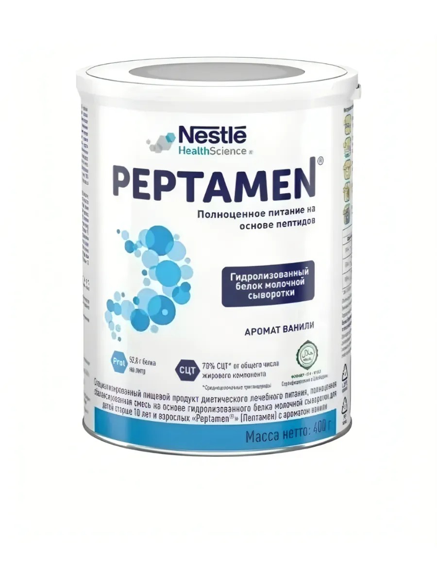 Peptamen- (Пептамен) - специализированное диетическое лечебное питание на основе гидролизованного белка молочной сыворотки для пацентов от 10 лет и взрослых с нарушенной функцией желудочно-кишечного тракта. Облегчит усвоение и всасывание всех необходимых питательных веществ у пациентов с резко пониженной способностью всасывания, для ускоренного восстановления после перенесенных заболеваний желудочно-кишечного тракта.