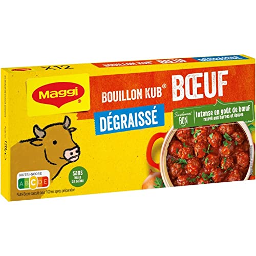 : Cook even more balanced meals with KUB Reduced-Fat Beef Stock Cube! For all your red meat and vegetable recipes, use this small cube containing 30 less fat . It will give your dishes a delicious cooked beef flavor! Tip: Crumble a stock cube directly into your tomato preparation to add a delicious cooked note to your Bolognese sauces. Contains 30 less fat compared to the average stock cube on the market (excluding reduced-fat stock cubes). Ingredients: Salt, sugar, starch, beef 8.9 : beef fat, beef cooking juices 2.5 flavorings (CELERY), color: plain caramel yeast extract, parsley, white pepper, roasted cloves, antioxidant: rosemary extract CELERY and thyme extracts. May contain: EGGS, MILK, WHEAT, OATS. P.when('A').execute(function(A) { A.on('a:expander:toggle_description:toggle:collapse', function(data) { window.scroll(0, data.expander. expander[0].offsetTop-100) }) }) Instructions for use ILIWQBiZwriZIWezwrwrIWILQBOqQB See moreKub Beef Reduced Fat Stock Cube 120g. NESTLE MAGGI. Cooking Aids. Cooking Aids, Salt and Spices. Savory Groceries.Description du produit Cuisinez toujours plus équilibré avec le Bouillon KUB Boeuf Dégraissé ! Pour toutes vos viandes rouges et vos recettes de légumes, utilisez ce petit cube contenant 30 de matières grasses en moins . Il donnera une délicieuse note de boeuf cuisiné à vos plats ! Astuce : émiettez un bouillon directement dans votre préparation à la tomate pour apporter une délicieuse note cuisinée à vos sauces bolognaises. Contient 30 de matières grasses en moins par rapport à la moyenne du marché des bouillons hors dégraissés. Ingrédients Ingrédients: Sel de cuisine, sucre, fécule, boeuf 8,9 : graisse de boeuf, jus de cuisson de viande de boeuf 2,5 arômes (CELERI), colorant : caramel ordinaire extrait de levure, persil, poivre blanc, clou de girofle torréfié, antioxydant : extraits de romarin extraits de CELERI et de thym. Peut contenir : OEUFS, LAIT, BLE, AVOINE. P.when('A').execute(function(A) { A.on('a:expander:toggle_description:toggle:collapse', function(data) { window.scroll(0, data.expander. expander[0].offsetTop-100) }) }) Mode d'emploi ILIWQBiZwriZIWezwrwrIWILQBOqQB Voir plusBouillon Kub Boeuf Degraisse 120G. NESTLE MAGGI. Aides Culinaires. Aides Culinaires, Sel Et Épices. Epicerie Salée.NESTLE MAGGI - Bouillon Kub Boeuf Degraisse 120G - le Lot De 4