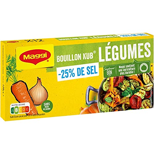 : Discover all of MAGGI's expertise now with the new Vegetable -25 Salt variety! Rediscover the delicious taste of your favorite vegetable stock cube in a 25 salt-free version. Made with quality vegetables and no artificial colors, this intensely flavored, cooked product will be the perfect partner for all your dishes: stews, soups, and stir-fries. Tip: To add a delicate and flavorful touch to your fish, crumble the cube directly onto the fish before cooking. Ingredients: Salts [table salt, mineral salt (potassium)], sugar, starch, palm oil , vegetables 9.7 : carrot, onion flavorings, yeast extract, turmeric, celery extract. 100 from responsible farming. May contain: eggs, milk, wheat, oats. P.when('A').execute(function(A) { A.on('a:expander:toggle_description:toggle:collapse', function(data) { window.scroll(0, data.expander. expander[0].offsetTop-100) }) }) Instructions for use ILIWQBiZwriZIWILJwwrwrQBQBOqQB See moreReduced Salt Vegetable Stock Cube 120g. NESTLE MAGGI. Cooking Aids. Cooking Aids, Salt and Spices. Savory Groceries.Description du produit Découvrez tout le savoir-faire de MAGGI maintenant sur la nouvelle référence Légumes -25 de sel ! Retrouvez le bon goût de votre bouillon de légumes dans votre petit cube préféré en version -25 de sel. Fabriqué avec de bons légumes de qualité et sans colorant, ce produit au goût intense et cuisiné sera l allié de tous vos plats : mijotés, soupes et poêlées. Astuce : pour apporter une note fine et gourmande à vos poissons, émiettez le cube directement sur leur dos avant cuisson. Ingrédients Ingrédients: Sels [sel de cuisine, sel minéral (potassium)], sucre, fécule, huile de palme , légumes 9,7 : carotte, oignon arômes, extrait de levure, curcuma, extrait de CELERI. 100 issue de plantations responsables. Peut contenir : OEUFS, LAIT, BLE, AVOINE. P.when('A').execute(function(A) { A.on('a:expander:toggle_description:toggle:collapse', function(data) { window.scroll(0, data.expander. expander[0].offsetTop-100) }) }) Mode d'emploi ILIWQBiZwriZIWILJwwrwrQBQBOqQB Voir plusBouillon Kub Legumes Sel Reduit 120G. NESTLE MAGGI. Aides Culinaires. Aides Culinaires, Sel Et Épices. Epicerie Salée.NESTLE MAGGI - Bouillon Kub Legumes Sel Reduit 120G - Lot De 4 - Livraison Gratuite