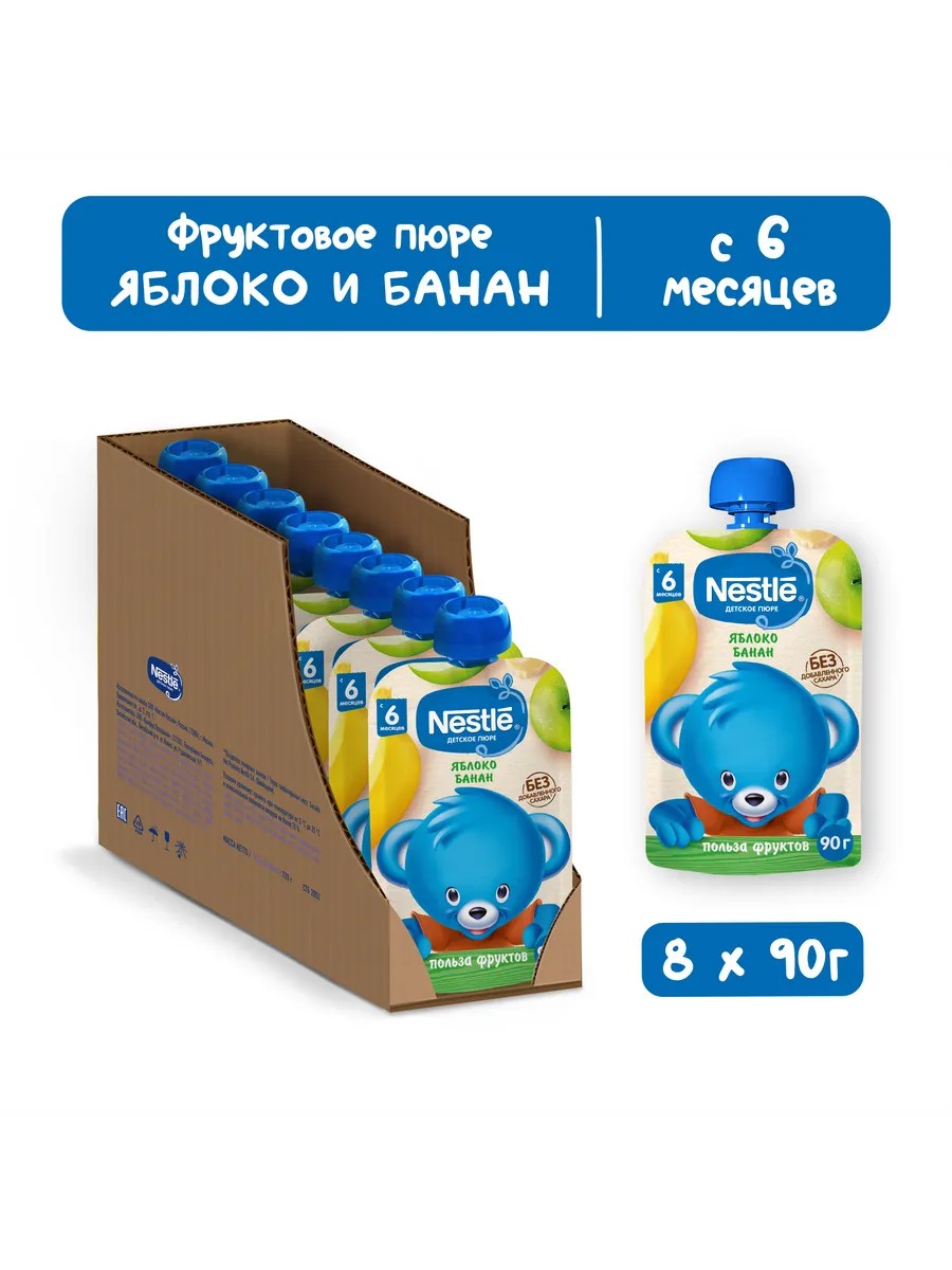 Новинка, которую стоит попробовать. Детское пюре «Яблоко и банан» от Нестле — это оригинальный фруктовый коктейль, в котором плоды наших садов встречаются с дарами тропиков. Отличный фруктовый перекус – подкрепление прибыло! Детское пюре «Яблоко и банан» отличается нежной консистенцией и превосходно подходит для продолжения прикорма. Если ваш малыш уже попробовал пюре из 100% яблок, настало время разнообразить его рацион и привнести в него немного тропической экзотики. Только полезные ингредиенты и ничего лишнего — вот рецепт прекрасного фруктового десерта для ребенка старше 6 месяцев! Полезный продукт для продолжения прикорма Соответствует навыкам питания малышей в возрасте 6 месяцев и старше Без добавленного сахара, искусственных консервантов, красителей, ароматизаторов, без ГМО. Мягкая упаковка — удобная и безопасная. Всемирная организация здравоохранения (ВОЗ) рекомендует исключительно грудное вскармливание в первые 6 месяцев жизни. Проконсультируйтесь со специалистом, когда вводить прикорм ребенку. После введения прикорма грудное вскармливание следует продолжать как можно дольше. Компания Nestle поддерживает данную рекомендацию. Детское фруктовое пюре Nestle «Яблоко и банан» для детей с 6 месяцев.