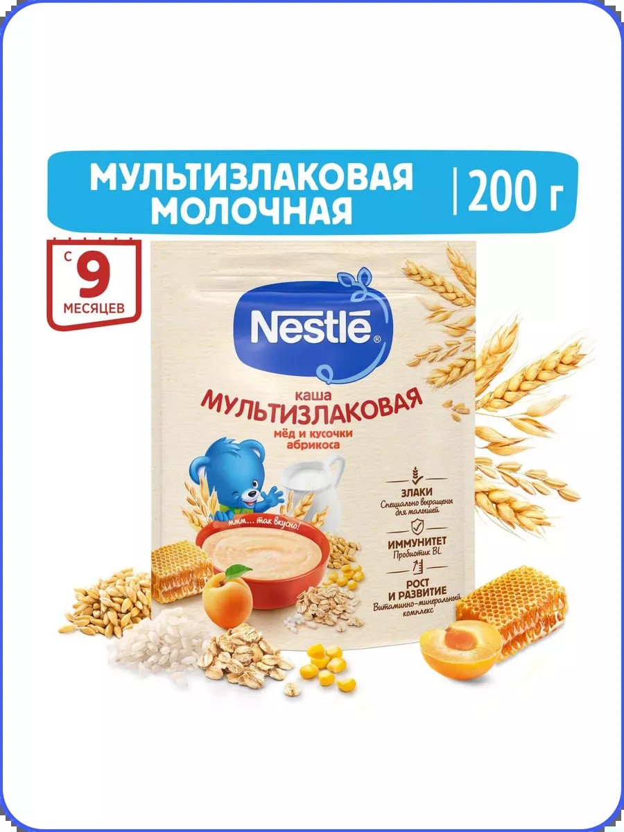 Молочная мультизлаковая каша с мёдом и кусочками абрикоса для питания детей старше 9 месяцев согласно законодательству РФ. Каша приготовлена с использованием особой технологии бережного расщепления злаков CHE. Благодаря этому в продукте появляется естественный сладкий вкус, каша лучше усваивается и имеет повышенную пищевую ценность. Каша является полезным сбалансированным прикормом для здоровых детей и отлично подходит для расширения рациона. 5 злаков (пшеница, греча, овес, рис и кукуруза) дополняют друг друга, обеспечивая ребенка питательными веществами. Обогащена пробиотиками - живыми бифидобактериями BL. Они способствуют нормализации пищеварения, росту здоровой микрофлоры и укреплению иммунитета, что очень важно в период введения прикорма. Каша содержит комплекс витаминов и минеральных веществ iRON+ для здорового роста и развития. Добавление фруктовых кусочков (абрикос) способствует развитию как вкусовых восприятий малыша, так и жевательных навыков, что очень важно в период постепенного перехода к взрослому меню.
