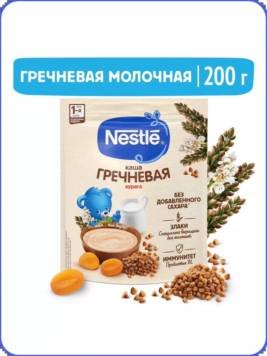 Каша Nestlé Молочная гречневая с курагой для продолжения прикорма 200г с бифидобактериями BL. Молочная гречневая каша Нестле с курагой для детей старше 5 месяцев согласно законодательству РФ. Каша приготовлена с использованием особой технологии бережного расщепления злаков CHE. Благодаря этому в продукте появляется естественный сладкий вкус, каша лучше усваивается и имеет повышенную пищевую ценность.Каша является полезным сбалансированным прикормом для здоровых детей. Обогащена пробиотиками - живыми бифидобактериями BL. Они способствуют нормализации пищеварения, росту здоровой микрофлоры и укреплению иммунитета, что очень важно в период введения прикорма. Каша содержит комплекс витаминов и минеральных веществ iRON+ для здорового роста и развития.