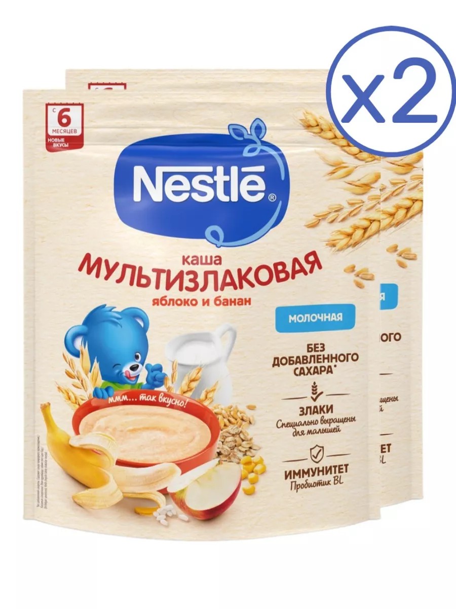 Молочная мультизлаковая каша с яблоком и бананом для питания детей старше 6 месяцев согласно законодательству РФ.