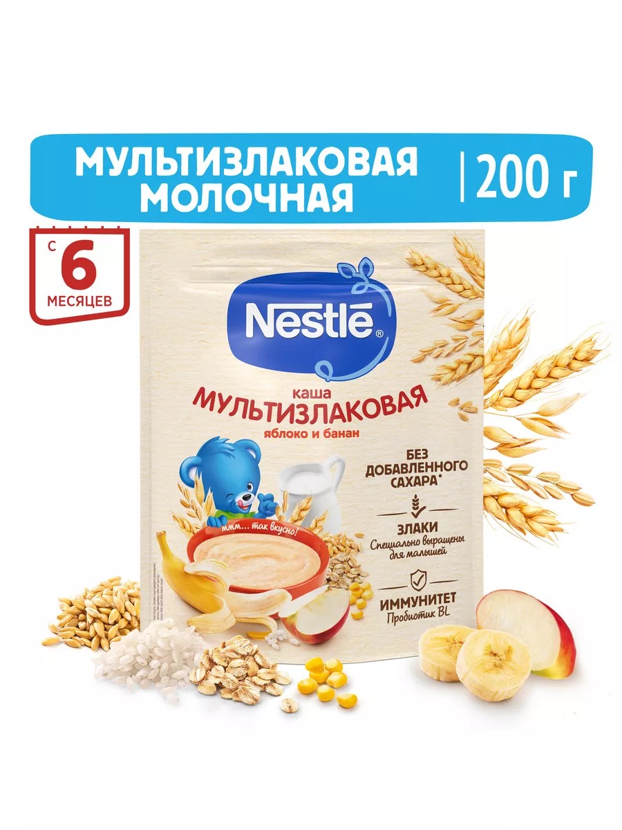 Multi-grain milk porridge with apple and banana for children over 6 months old, in accordance with Russian legislation.