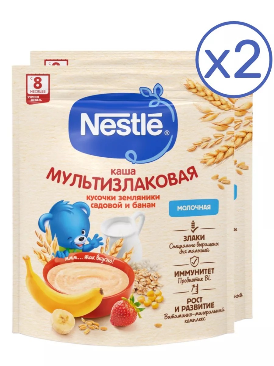 Молочная мультизлаковая каша с бананом и кусочками земляники для питания детей старше 8 месяцев согласно законодательству РФ. Каша Nestle является полезным сбалансированным прикормом для здоровых детей и отлично подходит для расширения рациона. Обогащена пробиотиками - полезными бифидобактериями BL. Они способствуют нормализации пищеварения, росту здоровой микрофлоры и укреплению иммунитета, что очень важно в период прикорма. Каша содержит комплекс витаминов и минеральных веществ для гармоничного роста и развития. Добавление фруктовых кусочков способствует развитию как вкусовых восприятий малыша, так и жевательных навыков, что очень важно в период постепенного перехода к взрослому меню.ВАЖНОЕ ЗАМЕЧАНИЕ: Мы считаем, что грудное вскармливание является идеальным началом питания для младенцев, и полностью поддерживаем рекомендацию Всемирной организации здравоохранения об исключительно грудном вскармливании в течение первых шести месяцев жизни с последующим введением адекватного питательного прикорма вместе с продолжением грудного вскармливания до двухлетнего возраста. Мы рекомендуем вам поговорить со специалистом о том, когда вводить продукты прикорма. Не является заменителем грудного молока.