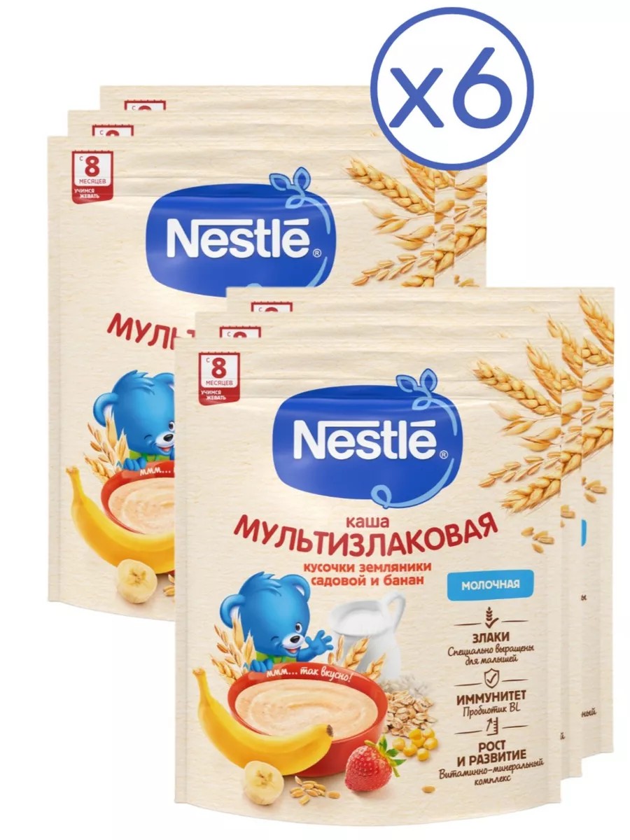 Молочная мультизлаковая каша с бананом и кусочками земляники для питания детей старше 8 месяцев согласно законодательству РФ. Каша Nestle является полезным сбалансированным прикормом для здоровых детей и отлично подходит для расширения рациона. Обогащена пробиотиками - полезными бифидобактериями BL. Они способствуют нормализации пищеварения, росту здоровой микрофлоры и укреплению иммунитета, что очень важно в период прикорма. Каша содержит комплекс витаминов и минеральных веществ для гармоничного роста и развития. Добавление фруктовых кусочков способствует развитию как вкусовых восприятий малыша, так и жевательных навыков, что очень важно в период постепенного перехода к взрослому меню.ВАЖНОЕ ЗАМЕЧАНИЕ: Мы считаем, что грудное вскармливание является идеальным началом питания для младенцев, и полностью поддерживаем рекомендацию Всемирной организации здравоохранения об исключительно грудном вскармливании в течение первых шести месяцев жизни с последующим введением адекватного питательного прикорма вместе с продолжением грудного вскармливания до двухлетнего возраста. Мы рекомендуем вам поговорить со специалистом о том, когда вводить продукты прикорма. Не является заменителем грудного молока.