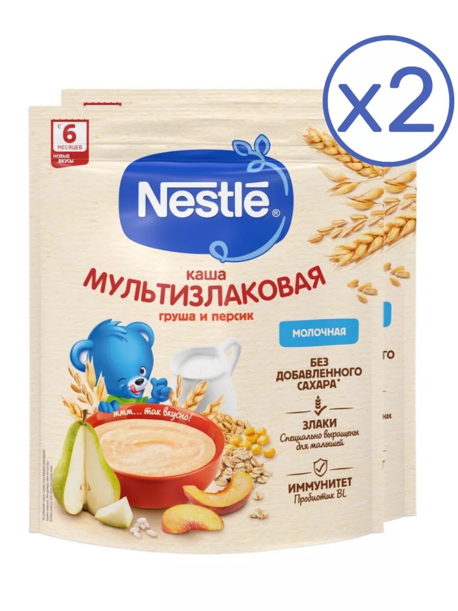 Multigrain milk porridge with pear and peach for children over 6 months old, according to Russian legislation.