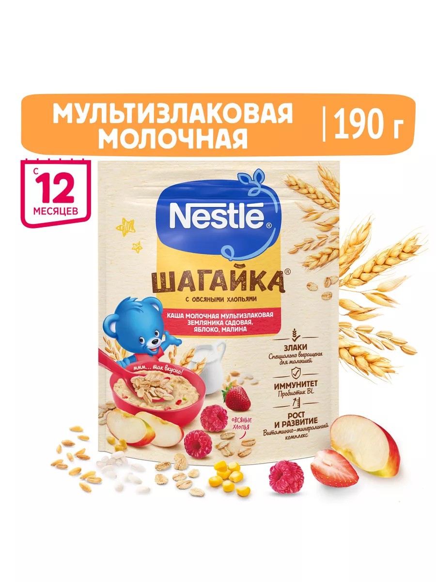 Молочная каша Nestle Шагайка мультизлаковая с овсяными хлопьями, кусочками земляники садовой, яблока и малиной для питания детей старше 12 месяцев согласно законодательству РФ