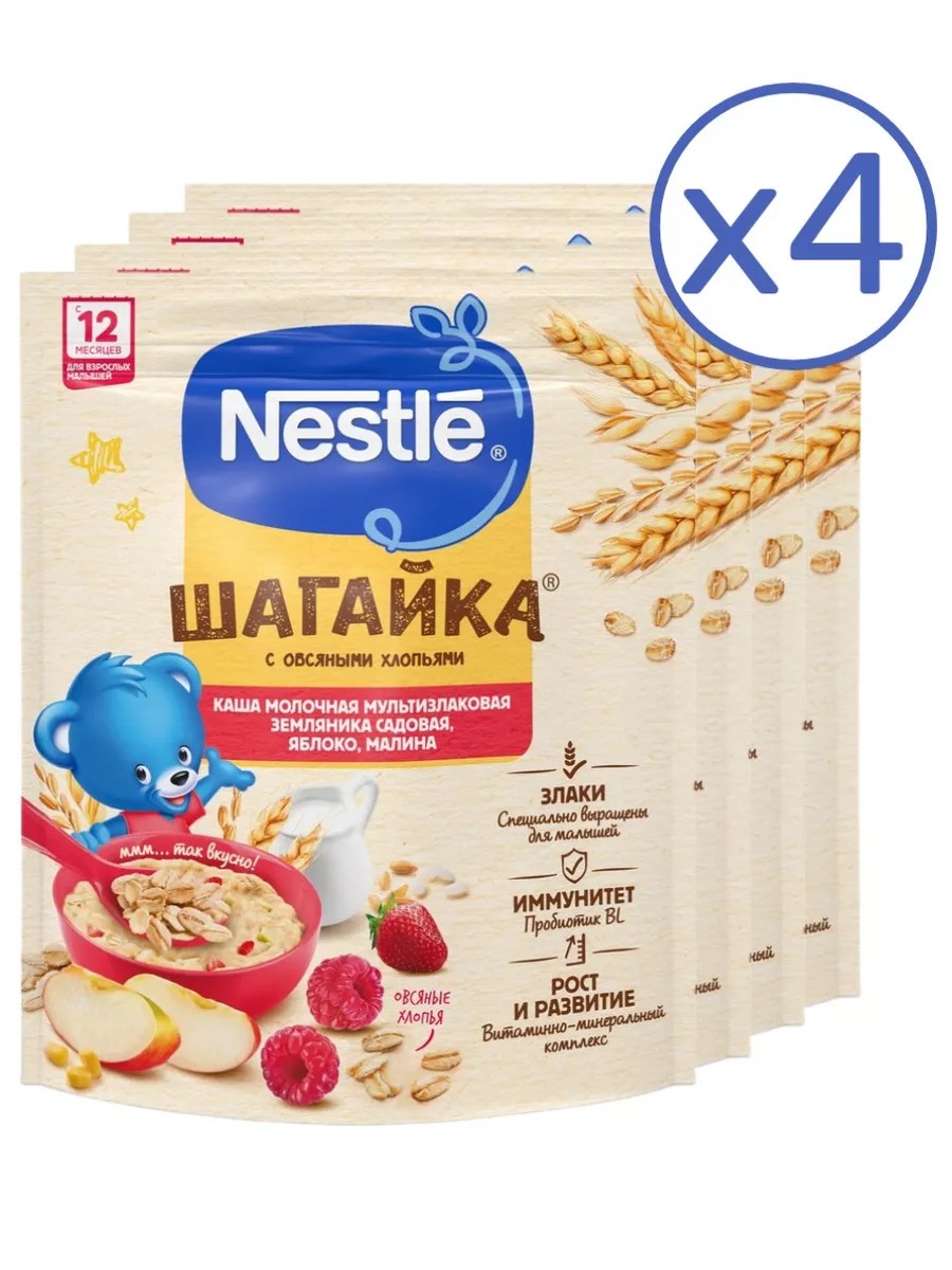 Молочная каша Nestle Шагайка мультизлаковая с овсяными хлопьями, кусочками земляники садовой, яблока и малиной для питания детей старше 12 месяцев согласно законодательству РФ
