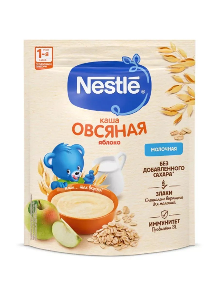 Nestlé Oatmeal with Apple Milk Porridge 200g for children 5 months and older. This oatmeal with apple milk porridge is suitable for children over 5 months of age and meets Russian legislation. Nestlé porridge is prepared using a special CHE technology, which gently breaks down grains. This technology creates a naturally sweet taste, improves digestibility, and enhances nutritional value. It is a healthy, balanced complementary food for healthy children. This porridge is enriched with probiotics—live bifidobacteria BL. They promote normal digestion, the growth of healthy microflora, and a stronger immune system, which is especially important during the introduction of complementary foods. This porridge contains the iRON+ vitamin and mineral complex for healthy growth and development. Preparation instructions: Wash your hands and use clean utensils. Boil drinking water for 5 minutes and let it cool to 40 degrees Celsius. Pour 150 ml of water into a clean bowl. Measure out 50 g of dry porridge (6 tablespoons) into a separate bowl. Gradually add the dry porridge to the bowl of water, stirring constantly until smooth. Start introducing solid foods with 1 tablespoon of porridge diluted with 4-5 tablespoons of boiled water. Gradually increase the amount of porridge to one full serving. Storage conditions: Store the unopened package in a dry place at a temperature no higher than 25 °C and a relative humidity of no more than 75%. After preparing the porridge, the opened package should be tightly sealed. After opening, the product should be stored for no more than 2 weeks. Precautions: Do not boil! Feed your baby with a clean spoon. The porridge should be prepared immediately before each feeding. Do not store the diluted porridge left over from feedings.