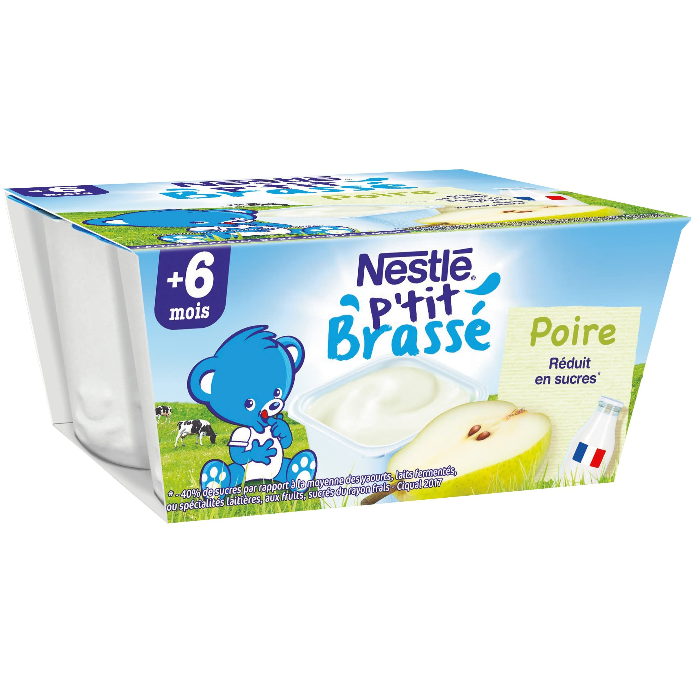 NESTLÉ P'tit Brassé, a dairy product with a delicious stirred texture combined with a good fruit taste to discover new flavors. Designed especially for babies from 6 months to 3 years old . Practical: no need for a fridge, it can be taken anywhere for baby's snack or dessert! And it's free from coloring and preservatives ! ( In accordance with baby food regulations). INGREDIENTS Ingredients: Whole MILK 75 , water, sugar, maltodextrin, pear puree 3.5 , starch, MILK proteins, thickener: pectin MILK mineral concentrate, minerals: magnesium citrate, zinc sulfate acidity regulator: citric acid lactic ferments (MILK), natural flavoring. DIRECTIONS FOR USE Store in a clean, dry place at room temperature. SAFETY WARNING Packaged in a protective atmosphere. Do not use if the packaging (jar, seal) is damaged. Do not store the product once opened. Made in France. No need to refrigerate, store at room temperature ( In accordance with baby food regulations). No preservatives or colorings . Just the right amount of protein . Rich in calcium. A delicious stirred texture combined with a delicious fruit flavor. NESTLÉ P'tit Brassé, un laitage à la texture brassée délicieuse associée à un bon goût de fruits pour découvrir de nouvelles saveurs. Conçu exprès pour les bébés de 6 mois à 3 ans . Pratique : pas besoin de frigo, il s'emporte partout pour le goûter ou le dessert de bébé ! Et c'est sans colorant , ni conservateur ! ( Conformément à la réglementation sur les aliments pour bébés). INGRÉDIENTS Ingrédients: LAIT entier 75 , eau, sucre, maltodextrine, purée de poire 3,5 , amidon, protéines de LAIT, épaississant : pectine concentré de minéraux du LAIT, minéraux : citrate de magnésium, sulfate de zinc correcteur d'acidité : acide citrique ferments lactiques (LAIT), arôme naturel. MODE D'EMPLOI Conserver dans un endroit propre, sec et à température ambiante. AVERTISSEMENT DE SÛRETÉ Conditionné sous atmosphère protectrice.Ne pas utiliser si l'emballage (pot, opercule) est abîmé. Ne pas conserver le produit une fois entamé. Fabriqué en France. Pas besoin de frigo, se conserve à température ambiante ( Conformément à la réglementation sur les aliments pour bébé). Sans conservateur ni colorant . Juste ce qu'il faut de protéines . Riche en calcium. Une délicieuse texture brassée associée à un bon goût de fruit.