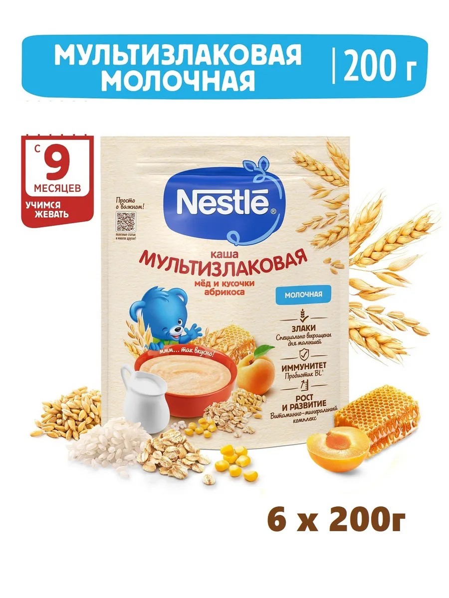 Multigrain milk porridge with honey and apricot pieces for children over 9 months old, according to Russian legislation.