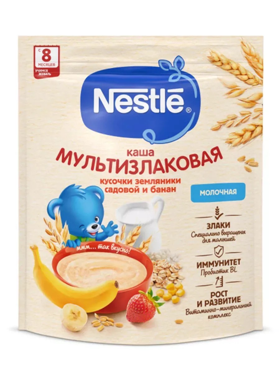 Каша Nestle мультизлаковая с бананом и кусочками земляники садовой молочная 200 гр для детей с 8 месяцев. Каша Nestlé приготовлена с использованием особой технологии бережного расщепления злаков CHE. Благодаря этому в продукте появляется естественный сладкий вкус, каша лучше усваивается и имеет повышенную пищевую ценность. Каша является полезным сбалансированным прикормом для здоровых детей и отлично подходит для расширения рациона. 5 злаков (пшеница, греча, овес, рис и кукуруза) дополняют друг друга, обеспечивая ребенка питательными веществами. Обогащена пробиотиками - живыми бифидобактериями BL. Они способствуют нормализации пищеварения, росту здоровой микрофлоры и укреплению иммунитета, что очень важно в период введения прикорма. Каша содержит комплекс витаминов и минеральных веществ iRON+ для здорового роста и развития. Добавление фруктовых кусочков (банан и земляника) способствует развитию как вкусовых восприятий малыша, так и жевательных навыков, что очень важно в период постепенного перехода к взрослому меню. Рекомендации по приготовлению: Вымойте руки и возьмите чистую посуду. Вскипятите питьевую воду в течение 5 мин и дайте ей остыть до 40 градусов С. Налейте в чистую тарелочку 150 мл воды. Отмерьте 50 г сухой каши (6 столовых ложек) в отдельную мисочку. Постепенно добавляйте в тарелочку с водой сухую кашу, непрерывно помешивая до однородного состояния. Начинайте вводить прикорм с 1 столовой ложки каши, разведенной 4-5 ложками кипяченой воды. Постепенно увеличивайте количество каши до одной целой порции. Условия хранения: закрытую пачку хранить в сухом месте при температуре не более 25 С и относительной влажности воздуха не более 75 %. После приготовления каши вскрытый пакет следует плотно закрыть. После вскрытия упаковки продукт следует хранить не более 2-х недель. Меры предосторожности: Не варите! Кормите ребенка чистой ложкой. Кашу следует готовить непосредственно перед каждым кормлением. Не храните оставшуюся после кормления разведенную кашу.