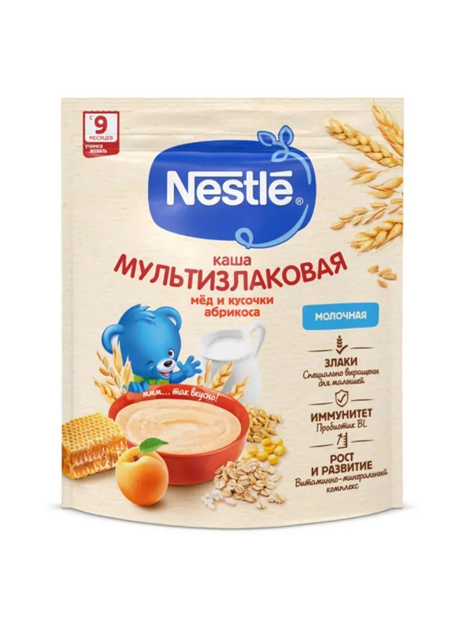 Каша Nestle мультизлаковая с медом и кусочками абрикоса молочная 200 гр для детей с 9 месяцев. Каша Nestlé приготовлена с использованием особой технологии бережного расщепления злаков CHE. Благодаря этому в продукте появляется естественный сладкий вкус, каша лучше усваивается и имеет повышенную пищевую ценность. Каша является полезным сбалансированным прикормом для здоровых детей и отлично подходит для расширения рациона. 5 злаков (пшеница, греча, овес, рис и кукуруза) дополняют друг друга, обеспечивая ребенка питательными веществами. Обогащена пробиотиками - живыми бифидобактериями BL. Они способствуют нормализации пищеварения, росту здоровой микрофлоры и укреплению иммунитета, что очень важно в период введения прикорма. Каша содержит комплекс витаминов и минеральных веществ iRON+ для здорового роста и развития. Добавление фруктовых кусочков (абрикос) способствует развитию как вкусовых восприятий малыша, так и жевательных навыков, что очень важно в период постепенного перехода к взрослому меню. Рекомендации по приготовлению: Вымойте руки и возьмите чистую посуду. Вскипятите питьевую воду в течение 5 мин и дайте ей остыть до 40 градусов С. Налейте в чистую тарелочку 150 мл воды. Отмерьте 50 г сухой каши (6 столовых ложек) в отдельную мисочку. Постепенно добавляйте в тарелочку с водой сухую кашу, непрерывно помешивая до однородного состояния. Начинайте вводить прикорм с 1 столовой ложки каши, разведенной 4-5 ложками кипяченой воды. Постепенно увеличивайте количество каши до одной целой порции. Условия хранения: закрытую пачку хранить в сухом месте при температуре не более 25 градусов и относительной влажности воздуха не более 75 %. После приготовления каши вскрытый пакет следует плотно закрыть. После вскрытия упаковки продукт следует хранить не более 2-х недель. Меры предосторожности: Не варите! Кормите ребенка чистой ложкой. Кашу следует готовить непосредственно перед каждым кормлением. Не храните оставшуюся после кормления разведенную кашу.