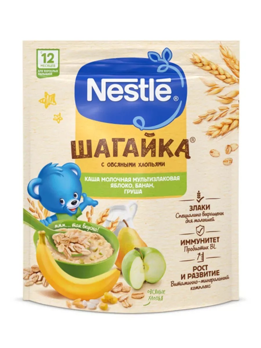 Каша Nestlé ШАГАЙКА Молочная мультизлаковая с яблоком, бананом, грушей с 12 мес 190г с бифидобактериями BL. Молочная каша Нестле 5 злаков, яблоко, банан, груша разработана специально для питания детей старше 12 месяцев согласно законодательству РФ. Каша ШАГАЙКА содержит натуральные овсяные хлопья и кусочки фруктов и ягод, которые создают особую текстуру и способствуют развитию навыков жевания, тем самым готовят ребенка к переходу на взрослый стол. Каждая порция содержит необходимые витамины и минеральные вещества, благодаря комплексу iRON+ в составе, а также бифидобактерии BL - пробиотики, которые способствуют нормализации пищеварения, росту здоровой микрофлоры и укреплению иммунитета, что очень важно в период активного развития растущего организма. Отобранное сочетание фруктов, ягод и злаков создают неповторимый вкус.ВАЖНОЕ ПРИМЕЧАНИЕ: идеальной пищей для грудного ребенка является молоко матери. Всемирная организация здравоохранения рекомендует исключительно грудное вскармливание в первые шесть месяцев и последующее введение прикорма при продолжении грудного вскармливания. Состав: мука (пшеничная (52,4 %) (содержит глютен), овсяная (7,2 %) (содержит глютен), рисовая (1,8 %), кукурузная (1,8 %)), молоко сухое обезжиренное (16,6 %), смесь растительных масел (низкоэруковое рапсовое, подсолнечное высокоолеиновое, подсолнечное), антиокислители (L-аскорбилпальмитат, альфа-токоферол, лимонная кислота), хлопья овсяные (5,2 %) (содержат глютен), кусочки яблока (3,1 %) (яблоко, сахар, крахмал кукурузный), кусочки банана (1 %), хлопья груши (1 %), минеральные вещества (кальция карбонат, железа (II) фумарат, цинка сульфат, йодид калия), витамины (С (L-аскорбиновая кислота), E (DL-альфа-токоферола ацетат), РР (никотинамид), B5 (D-пантотенат кальция), A (ретинола ацетат), В1 (тиамина мононитрат), В6 (пиридоксин гидрохлорид), В2 (рибофлавин), B9 (фолиевая кислота), D (D3 холекальциферол)), бифидобактерии не менеене менее 1х10^6 КОЕ/г