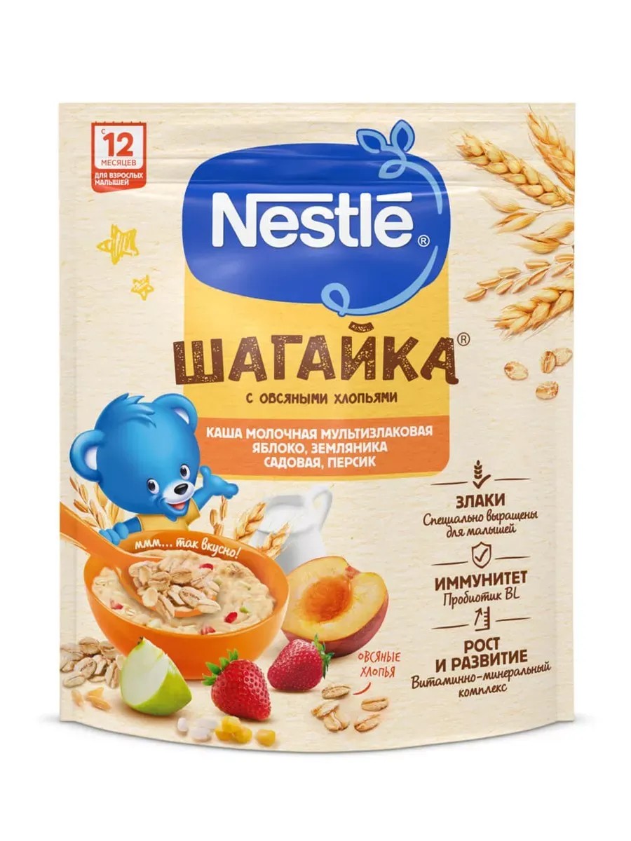 Nestlé Shagaika Multigrain Milk Porridge with Oatmeal, Apple, Strawberry, and Peach, 190g for children 12 months and older. This multigrain milk porridge with apple, strawberry, and peach is specially formulated for children over 12 months of age in accordance with Russian legislation. Nestlé Shagaika porridge contains natural oatmeal and pieces of fruit and berries, which create a special texture and promote chewing skills, thereby preparing the child for the transition to adult nutrition. Each serving contains essential vitamins and minerals, thanks to the iRON+ complex, as well as bifidobacteria BL - probiotics that promote normal digestion, the growth of healthy microflora, and a stronger immune system, which is essential during the period of active development of a growing body. A carefully selected combination of fruits, berries, and grains creates a unique taste. Preparation instructions: Wash your hands and use clean utensils. Boil drinking water for 5 minutes and let it cool to 40°C. Pour 150 ml of water into a clean plate. Measure out 50 g of dry porridge (6 tablespoons) into a separate bowl. Gradually add the dry porridge to the plate with water, stirring constantly until smooth. Start introducing solid foods with 1 tablespoon of porridge diluted with 4-5 tablespoons of boiled water. Gradually increase the amount of porridge to one full serving. Storage conditions: Store the unopened package in a dry place at a temperature no higher than 25°C and a relative humidity of no more than 75%. After preparing the porridge, close the opened package tightly. After opening, the product should be stored for no more than 2 weeks. Precautions: Do not boil! Feed your baby with a clean spoon. The porridge should be prepared immediately before each feeding. Do not store leftover diluted porridge after feeding.