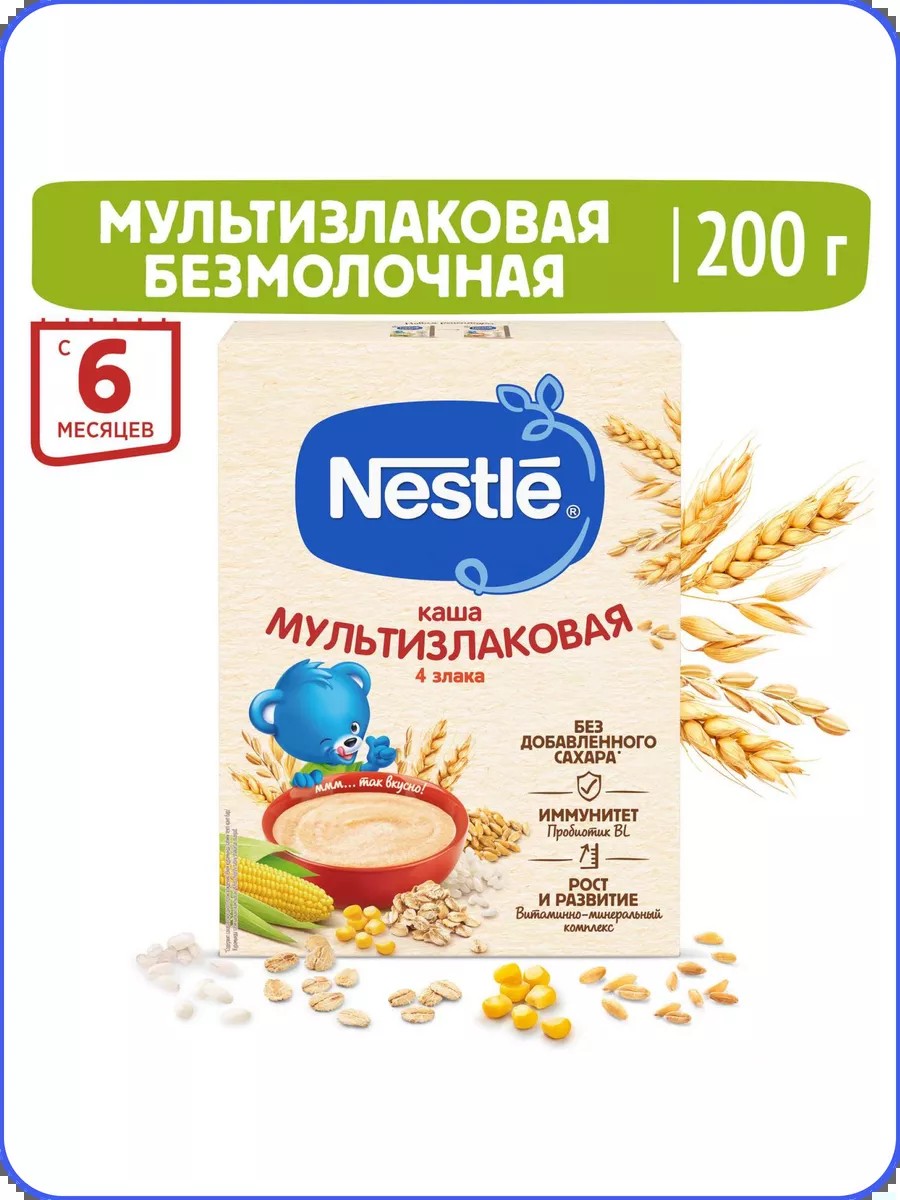 Безмолочная мультизлаковая каша для питания детей старше 6 месяцев согласно законодательству РФ. Каша Nestlé обогащена пробиотиком BL, который способствует нормализации пищеварения, росту здоровой микрофлоры и укреплению иммунитета, что очень важно в период прикорма. Одна порция содержит комплекс витаминов и минеральных веществ для здорового роста и развития ребёнка. Не содержит добавленного сахара, что способствует формированию правильных привычек питания и заботе о здоровье малыша с раннего возраста. Приятный вкус злаков порадует вашего малыша. Без пальмового масла.