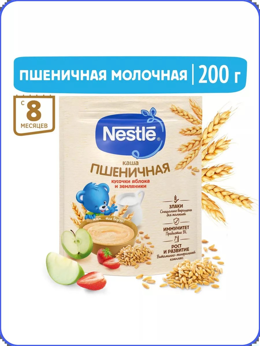 Nestle Молочная пшеничная каша с кусочками яблока и земляникой с 8 мес. 200 г Идеальной пищей для грудного ребенка является молоко матери. Всемирная организация здравоохранения рекомендует исключительно грудное вскармливание в первые шесть месяцев и последующее введение прикорма при продолжении грудного вскармливания. Компания Нестле поддерживает данную рекомендацию. Для принятия решения о сроках и способе введения данного продукта в рацион ребенка необходима консультация специалиста. Особенности: Каша приготовлена с использованием особой технологии бережного расщепления злаков CHE. Благодаря этому в продукте появляется естественный сладкий вкус, каша лучше усваивается и имеет повышенную пищевую ценность. Каша является полезным сбалансированным прикормом для здоровых детей и отлично подходит для расширения рациона.Обогащена пробиотиками - живыми бифидобактериями BL. Они способствуют нормализации пищеварения, росту здоровой микрофлоры и укреплению иммунитета, что очень важно в период введения прикорма. Каша содержит комплекс витаминов и минеральных веществ iRON+ для здорового роста и развития. Добавление фруктовых кусочков (яблоко и земляника) способствует развитию как вкусовых восприятий малыша, так и жевательных навыков, что очень важно в период постепенного перехода к взрослому меню.