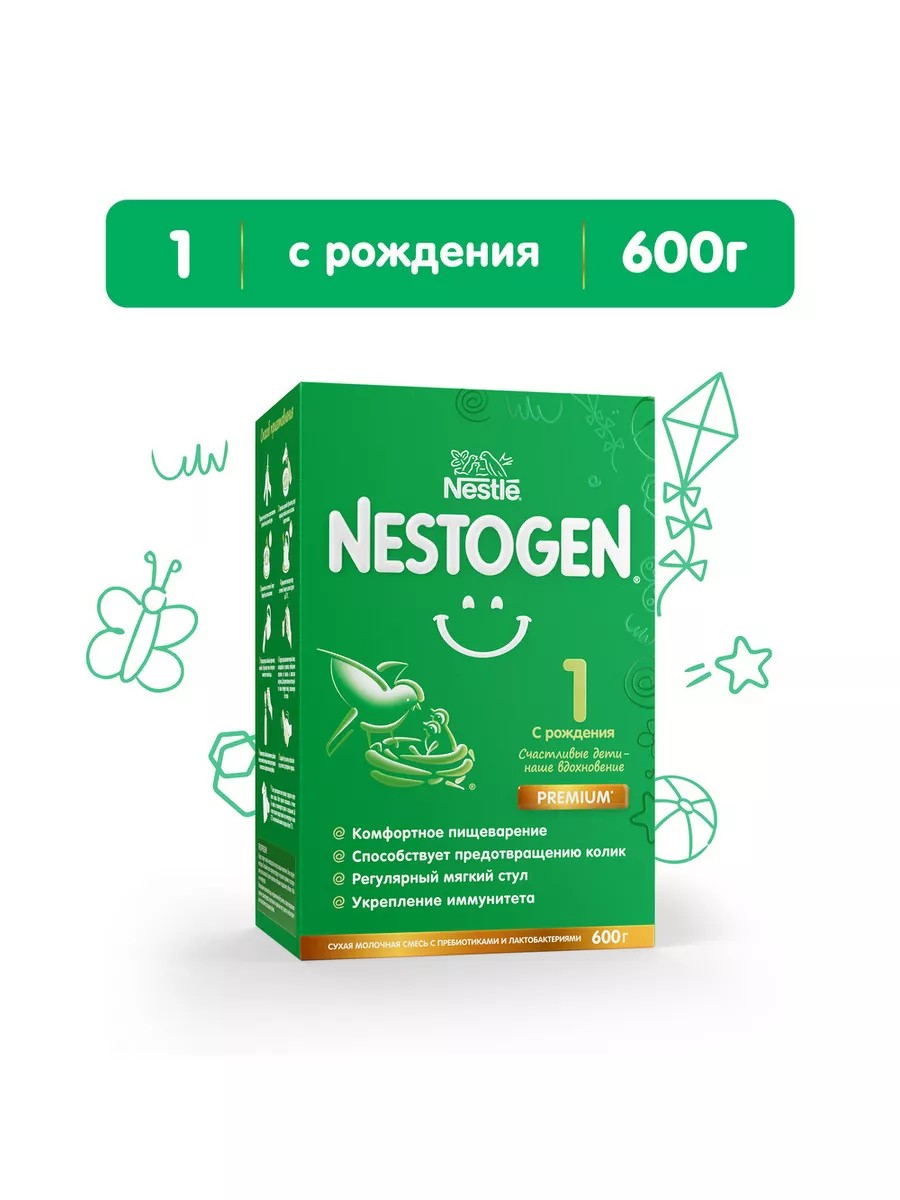Nestogen 1 formula for regular, soft stools from 0 months, 600 g. Nestogen 1 formula was specially developed to provide balanced, healthy nutrition and comfortable digestion for babies. Nestogen 1 formula, with prebiotics and unique L. reuteri lactobacilli, helps improve intestinal motility, promote regular, soft stools, support beneficial microflora, and prevent colic. Healthy intestinal microflora is essential for maintaining, developing, and strengthening the immune system. Ingredients: Skim milk, demineralized whey, lactose, maltodextrin, a mixture of vegetable oils (low-erucic rapeseed, sunflower, high-oleic sunflower, coconut), milk fat, prebiotics (galactooligosaccharides (GOS) and fructooligosaccharides (FOS)), calcium citrate, emulsifier (soy lecithin), potassium citrate, sodium citrate, potassium phosphate, magnesium chloride, vitamin complex (C (sodium L-ascorbate, U (DL-alpha-tocopherol acetate), PP (nicotinamide), calcium D-pantothenate, ascorbyl palmitate (C), DL-alpha-tocopherol acetate (E), nicotinamide (PP), calcium D-pantothenate, B1 (thiamine mononitrate), A (retinol acetate), B6 (pyridoxine hydrochloride), B2 (riboflavin), folic acid (B9), R (phytomenadione), D-biotin, D3 (cholecalciferol), B12 (cyanocoblamine)), potassium chloride, sodium chloride, fish oil, lactobacillus culture L. reuteri (at least 1.0x10^6 CFU/g), taurine, inositol, ferrous sulfate, zinc sulfate, nucleotides, L-carnitine, copper sulfate, manganese sulfate, potassium iodide, lutein, sodium selenate. IMPORTANT NOTICE: We believe that breastfeeding is the ideal start in nutrition for infants and fully support the World Health Organization's recommendation of exclusive breastfeeding for the first six months of life, followed by the introduction of adequate nutritional complementary foods, together with continued breastfeeding until two years of age.