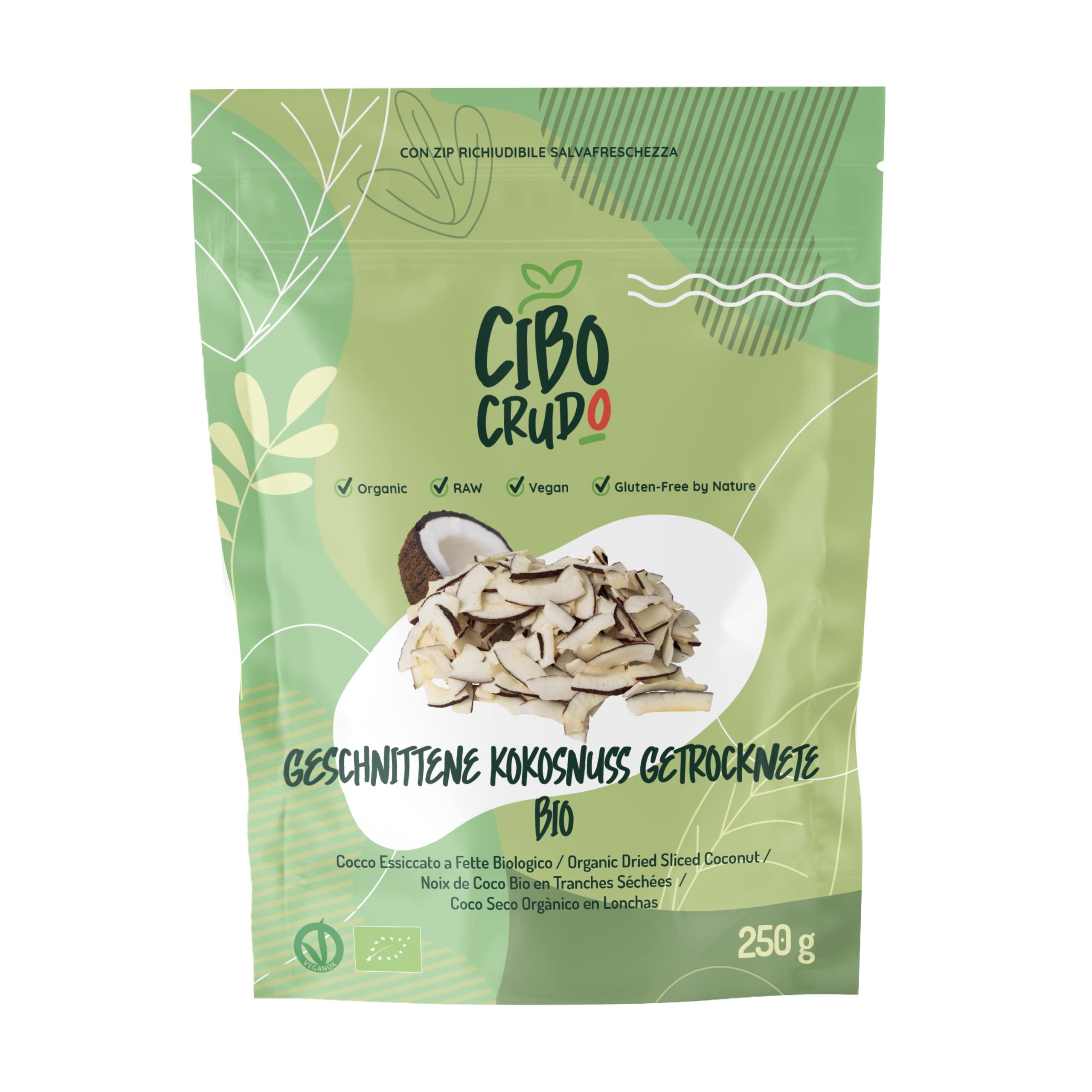 CiboCrudo Raw Coconut Smiles are a certified organic product. We select only the finest coconuts, sourced from producers who do not use chemicals, bleach, or additives, and who do not harvest them through monkeys. These coconut chips are vegan and naturally gluten-free, contain over 12 fiber, and are naturally sun-dried: they are suitable for a raw diet because they are processed at temperatures always below 42 degrees Celsius. CiboCrudo's delicious coconut chips are 100 natural: we do not add sulfites or sugar, giving them a delicate, not overly sweet flavor. Their crunchy texture makes them an excellent natural snack, delicious added to smoothies and yogurt, perfect for pudding, raw candy, bars, or cookies, even raw. Try them in your kitchen combined with recipes featuring chocolate, bananas, or in exotic dishes, even savory ones. We remind you that CiboCrudo always produces processed foods at temperatures below 42 C. We use artisanal production techniques to guarantee the best results with the least impact on the environment. Visit the CiboCrudo website and discover our wide selection of dried fruit, all organic, whole, and naturally gluten-free. INGREDIENTS: Sliced coconutGeraspte biologische kokosschijfjes - 250 g. Ongezouten, zongedroogde, gedroogde kokos. Rauw, niet chemisch gebleekt. Zwavelvrij. Ideaal voor snacks en zoete recepten. Kokosschijfjes 250 g (1-pack) De Raw Coconut Smiles van CiboCrudo zijn een gecertificeerd biologisch product. We selecteren alleen de beste kokosnoten, afkomstig van producenten die geen chemicaliën, bleekmiddelen of additieven gebruiken en die geen apen gebruiken voor de oogst. Deze kokoschips zijn veganistisch en van nature glutenvrij, bevatten meer dan 12 vezels en worden op natuurlijke wijze in de zon gedroogd: ze zijn geschikt voor een rauw dieet omdat ze worden verwerkt bij temperaturen die altijd lager zijn dan 42 graden. De heerlijke kokosschijfjes van CiboCrudo zijn 100 natuurlijk: we voegen geen sulfieten of suiker toe: hierdoor hebben ze een delicate en niet al te zoete smaak. Hun knapperige textuur maakt ze uitstekend als natuurlijk tussendoortje, heerlijk om toe te voegen aan smoothies en yoghurt, perfect voor pudding, rauw snoep, repen of koekjes, zelfs rauw. Probeer ze in de keuken in combinatie met recepten met chocolade, met bananen of in exotische gerechten, zelfs hartige. We herinneren u eraan dat CiboCrudo altijd bewerkte voedingsmiddelen produceert die minder dan 42 C zijn. We gebruiken ambachtelijke productietechnieken om het beste resultaat te garanderen met de minste impact op het milieu. Bezoek de website van CiboCrudo en ontdek onze ruime keuze aan gedroogd fruit, volledig biologisch, heel en van nature glutenvrij. INGREDIËNTEN In plakjes gesneden kokosnoot