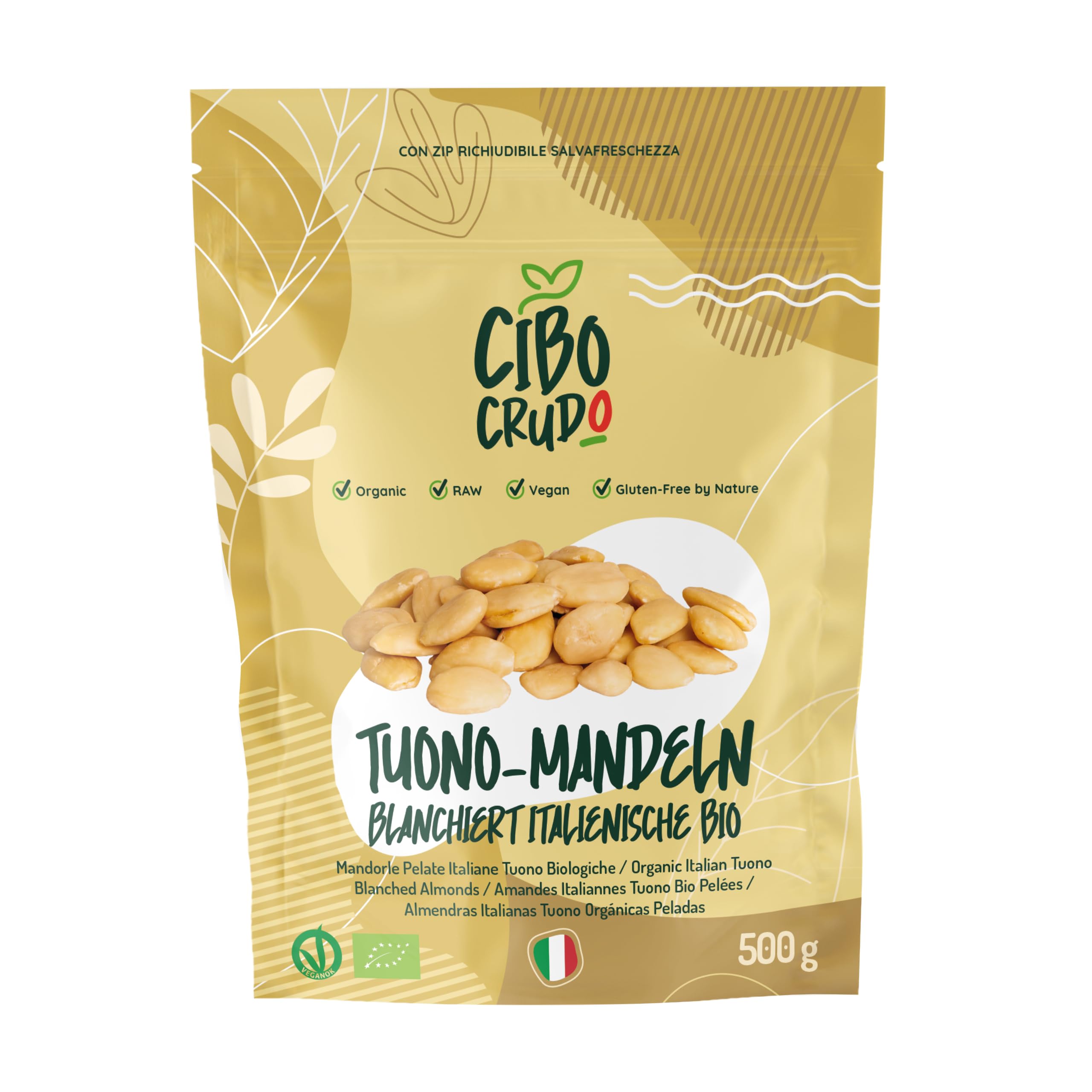 The Tuono almond variety is characterized by an incredible sweetness and an intense taste. These organic peeled almonds come from Sicily, where they are grown in certified organic agriculture. Our artisan farmers select the best almonds and dry them gently in the sun, without chemical additives, aggressive roasting or bleaching. It is a raw, vegan and naturally gluten-free product, always processed below 42 degrees Celsius to keep both the taste and nutritional value of the almonds unchanged. CiboCrudo Tuono peeled almonds contain a lot of vitamin E, omega-3 and omega-6 fatty acids, proteins and calcium: ideal for those who lead an active lifestyle. Try them in almond milk or an almond dessert, add them to granola and muesli, use them in a delicious olive pate or eat them as a snack, plain. We remind you that CiboCrudo always produces processed products below 42 degrees Celsius, using artisanal production techniques to guarantee the best result with the least impact on the environment. Visit the CiboCrudo website and discover our extensive range of dried fruit, all organic, whole and naturally gluten-free. INGREDIENTS almonds INSTRUCTIONS FOR USE Consume 4-5 peeled almonds daily. MANUFACTURER CONTACT INFORMATION Neulabs SRL, Via Bernardino Zenale, 19 21, 20123, Milan, IT See moreTuono Biologische Gepelde Amandelen Niet-Bitter - 500 g. Biologische Rauwe Siciliaanse Amandelen Niet Geroosterd. Bron van Calcium en Vitamine E. Gedroogd Fruit uit Sicilië. Amandelen geblancheerd 500 g (1-pack) De Tuono amandelvariëteit kenmerkt zich door een ongelooflijke zoetheid en een intense smaak. Deze biologische gepelde amandelen komen uit Sicilië, waar ze worden geteeld in gecertificeerde biologische landbouw. Onze ambachtelijke boeren selecteren de beste amandelen en drogen ze voorzichtig in de zon, zonder chemische toevoegingen, agressief roosteren of bleken. Het is een rauw, veganistisch en van nature glutenvrij product, altijd verwerkt onder 42 graden Celsius om zowel de smaak als de voedingswaarde van de amandelen onveranderd te houden. CiboCrudo Tuono gepelde amandelen bevatten veel vitamine E, omega-3 en omega-6 vetzuren, eiwitten en calcium: ideaal voor wie een actieve levensstijl heeft. Probeer ze eens in amandelmelk of een amandeldessert, voeg ze toe aan granola en muesli, gebruik ze in een heerlijke olijvenpaté of eet ze als tussendoortje, puur. We herinneren je eraan dat CiboCrudo altijd bewerkte producten produceert onder 42 graden Celsius, met behulp van ambachtelijke productietechnieken om het beste resultaat te garanderen met de minste impact op het milieu. Bezoek de website van CiboCrudo en ontdek ons uitgebreide assortiment gedroogd fruit, allemaal biologisch, heel en van nature glutenvrij. INGREDIËNTEN amandelen GEBRUIKSAANWIJZING Consumeer dagelijks 4-5 gepelde amandelen. CONTACTINFORMATIE FABRIKANT Neulabs SRL, Via Bernardino Zenale, 19 21, 20123, Milan, IT Meer bekijken