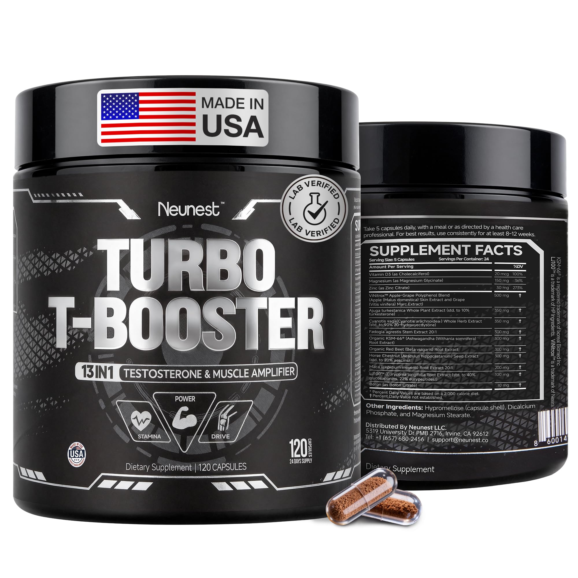 PREMIUM INGREDIENTS, USA-MADE QUALITY — Each bottle contains 120 vegan, gluten-free capsules made with non-GMO ingredients in a cGMP certified facility. Our packaging clearly highlights: Non-GMO cGMP Vegetarian Gluten-Free—ensuring you receive the highest quality supplement you deserve. OPTIMAL DOSAGE CONVENIENCE — High-Potency 2690mg Formula with Clinically Studied Ingredients : Each serving delivers 2690mg across 13 functional ingredients—including LJ100 Tongkat Ali, shown in studies to support male performance parameters KSM-66 Ashwagandha, clinically researched for stress balance and physical readiness and robust botanicals like Black Maca and Tribulus. With 120 capsules, your month-long regimen is simple, consistent, and hassle-free. SUSTAINED ENERGY STAMINA — Power Through Every Session : Turbo T-Booster's 13-in-1 performance matrix is crafted to support testosterone synthesis, promote consistent energy, and enhance endurance output. The blend of adaptogens, botanicals, and metabolic cofactors helps you train harder, stay sharp, and keep your performance elevated from start to finish. . MORE THAN TESTOSTERONE — Triple-Path Test Support : Micronutrients (D3 Zn Mg) support testosterone synthesis and metabolism. Adaptogens like KSM-66 Ashwagandha help the body stay balanced under daily stressors. Time-tested botanicals—LJ100 Tongkat Ali, Fadogia Agrestis, Tribulus Terrestris, and Black Maca—work synergistically to promote vitality, drive, stamina, post-training muscle recovery and overall male performance. . 13-IN-1 TESTOSTERONE MATRIX — Testosterone, Stamina Energy Support : This 2690mg blend integrates micronutrients (D3, Zinc, Magnesium), performance botanicals (Tongkat Ali, Ashwagandha, Tribulus, Maca), and endurance boosters (Beet Root, ViNitrox) to support testosterone pathways, promote muscle performance, assist circulation, help manage daily stress, and maintain hormonal balance—all in one comprehensive formula. .