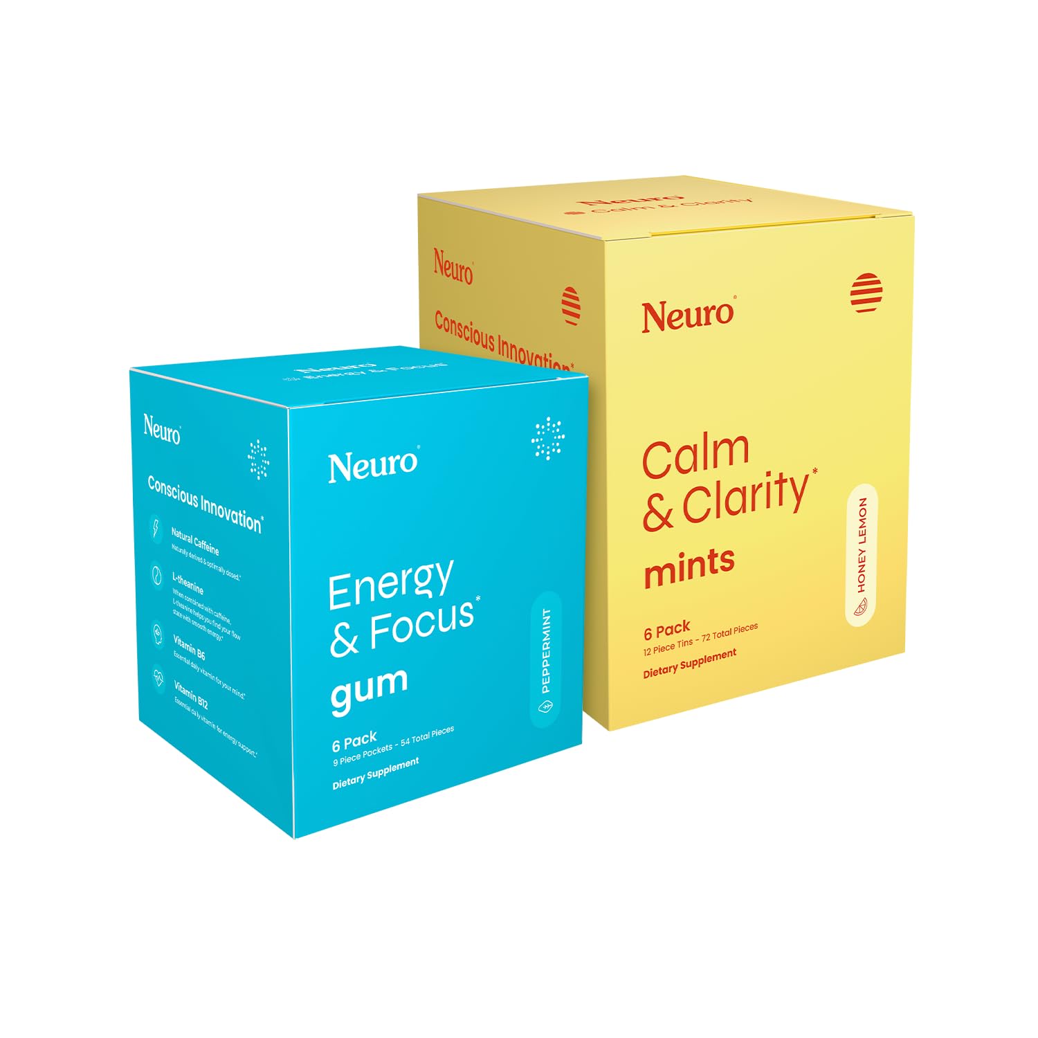 CLEAN INGREDIENTS – Clarity and productivity without ingesting artificial forms of energy or a handful of pills. All Neuro products are aspartame-free, sugar-free, non-GMO, and gluten-free. Flexible Support for Mind Mood – Use the gum for energized focus and the mints for calm, centered clarity. Both formats are portable, fast-acting, and support productivity without pills or sugary drinks. Calm Clarity Mints (60ct) – Formulated with GABA, L-theanine, and vitamin D3, these relaxing mints help ease temporary stress and support calm mental clarity—perfect for evening use or stressful moments. Energy Focus Gum (54ct) – Each piece contains 40mg natural caffeine, L-theanine, and B-vitamins to boost alertness, enhance focus, and eliminate energy crashes without sugar or artificial ingredients. NeuroGum Day Night Support Set – Includes Energy Focus Peppermint Gum and Calm Clarity Honey Lemon Mints for a 360 approach to mental performance—daytime energy and nighttime relaxation.