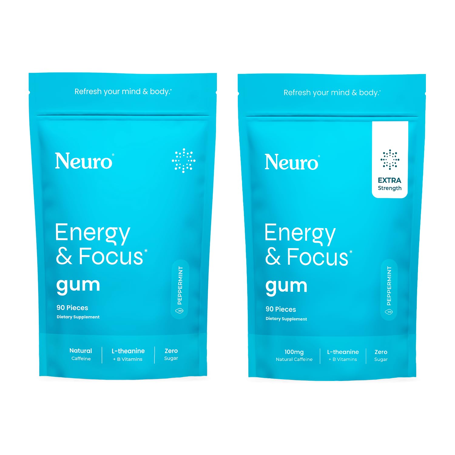 Neuro Energy & Focus Gum Duo Original & Extra Strength Peppermint Gum (90ct Bags) Natural Caffeine L-Theanine B12 + B6 Sugar-Free Nootropic Supplement for Clean Focus