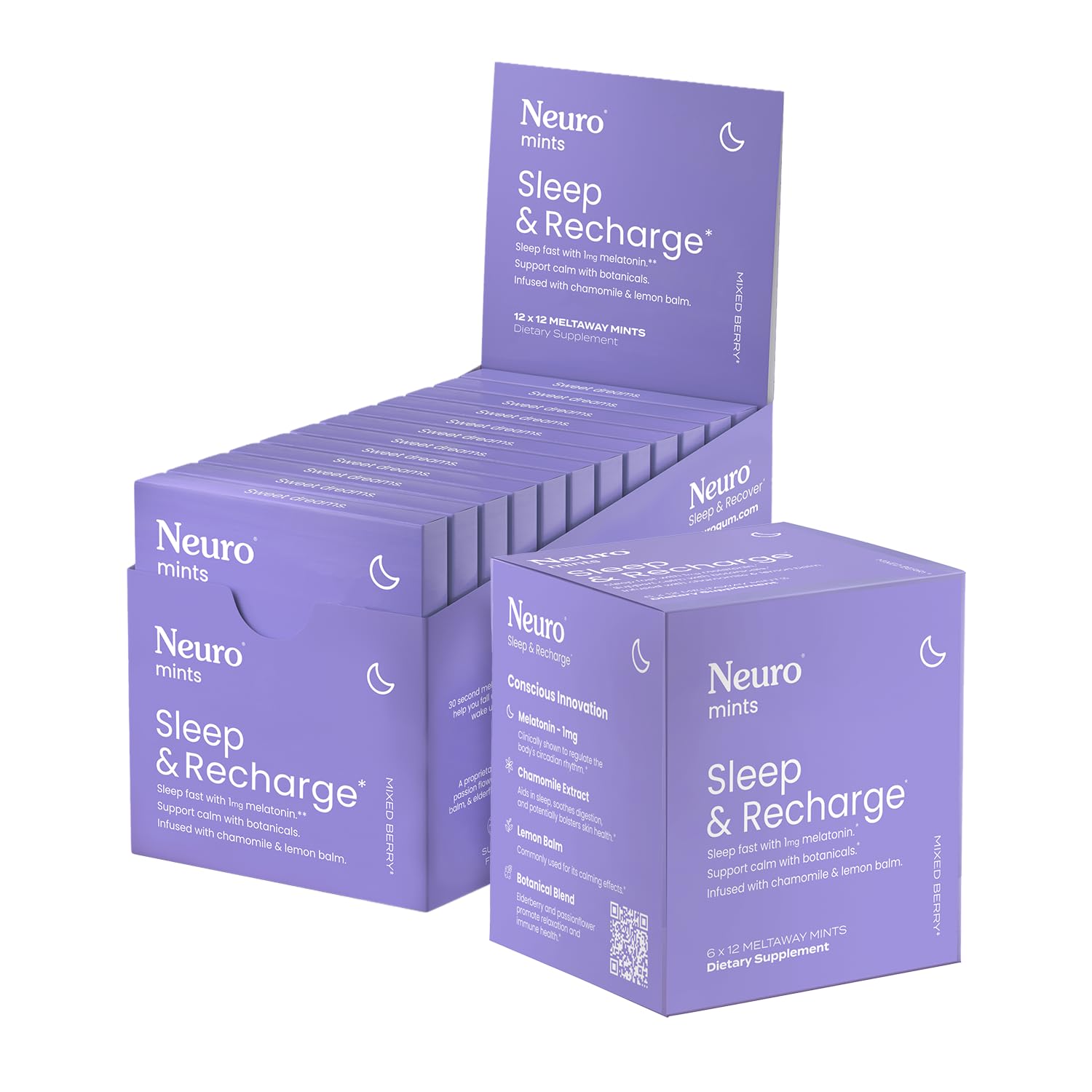 Relax, unwind, and recharge naturally with the Neuro Sleep Recharge Set — two powerful nighttime supplements formulated to help you fall asleep faster and wake up refreshed. NeuroGum Sleep Recharge Meltaway Mints feature 1mg melatonin blended with chamomile, elderberry, lemon balm, and passion flower to calm your mind and ease restlessness. Each mint melts smoothly on your tongue for fast, convenient absorption. For extended nightly support, Neuro Melatonin 1mg Sleep Recharge Mints (144 Pieces) provide the same sugar-free, mixed berry formula in a larger pack size — perfect for consistent use and long-term rest support. Both formulas are vegan, aspartame-free, and designed to promote restful, uninterrupted sleep without grogginess. Together, they offer a simple, effective way to wind down, relax, and wake up recharged.Consistent Rest Recovery – Designed for nightly use, this caffeine-free sleep support helps you maintain a balanced sleep routine. Wake clear-headed, restored, and ready for the day ahead. Neuro Melatonin 1mg Sleep Recharge Mints – A long-lasting supply of the same gentle formula, combining melatonin with chamomile and lemon balm to help you fall asleep faster and wake up feeling refreshed. Fast-Dissolving Convenient – Meltaway format offers rapid absorption and smooth flavor for bedtime ease. Sugar-free, portable, and perfect for travel or nights when you need relaxation on demand. NeuroGum Sleep Recharge Meltaway Mints – Each mint combines 1mg melatonin with chamomile, elderberry, lemon balm, and passion flower to calm the mind, reduce stress, and encourage faster, deeper sleep. What's Included – This 2-piece set includes NeuroGum Sleep Recharge Meltaway Mints (72 count) and Neuro Melatonin 1mg Sleep Recharge Mints (144 count) — both designed to promote deep, restful sleep naturally.