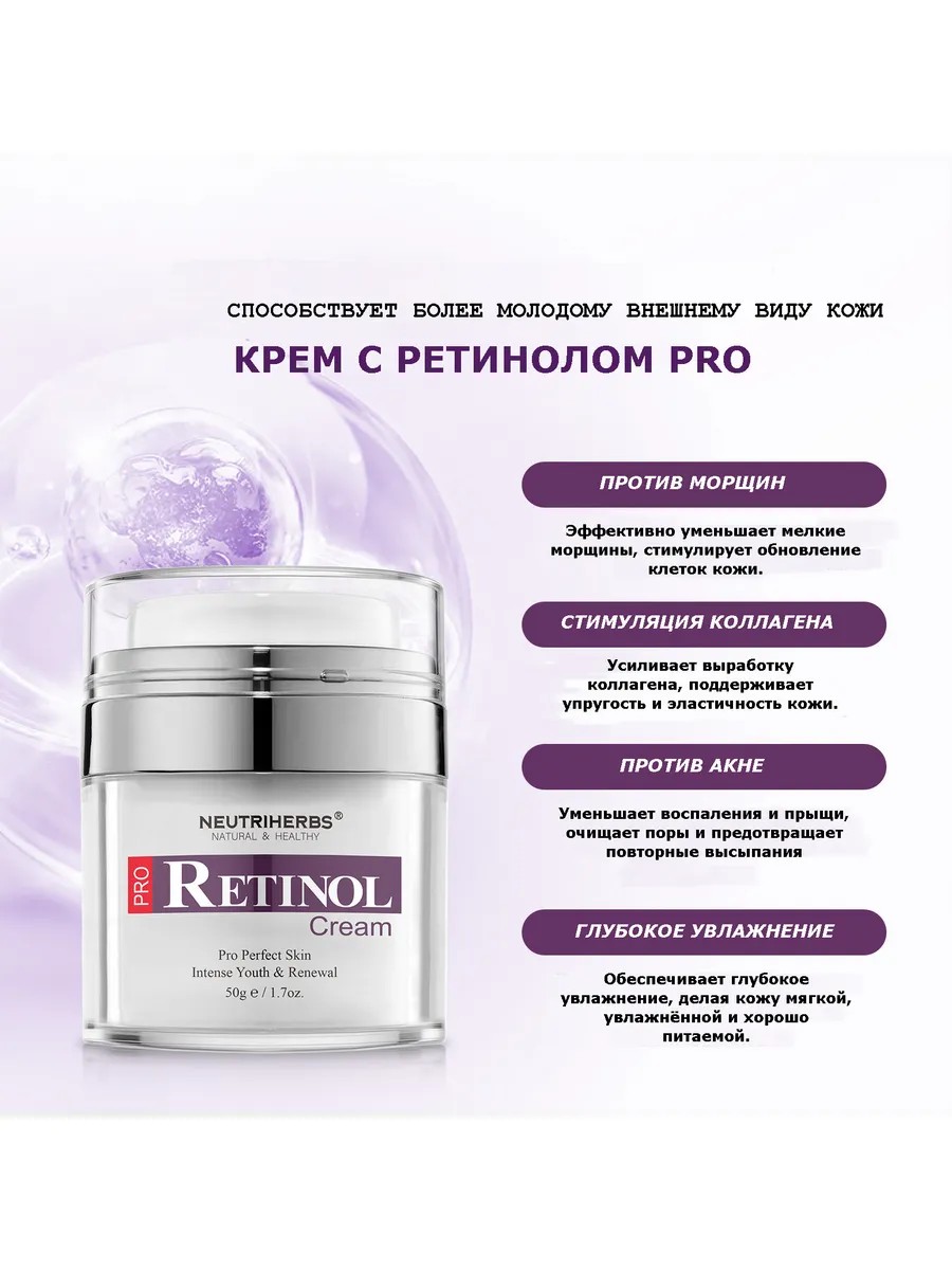 | Полное наименование товара | Крем для лица с ретинолом NEUTRIHERBS Pro Retinol Cream, антивозрастной, омолаживающий, 50 г (люксовая косметика) |