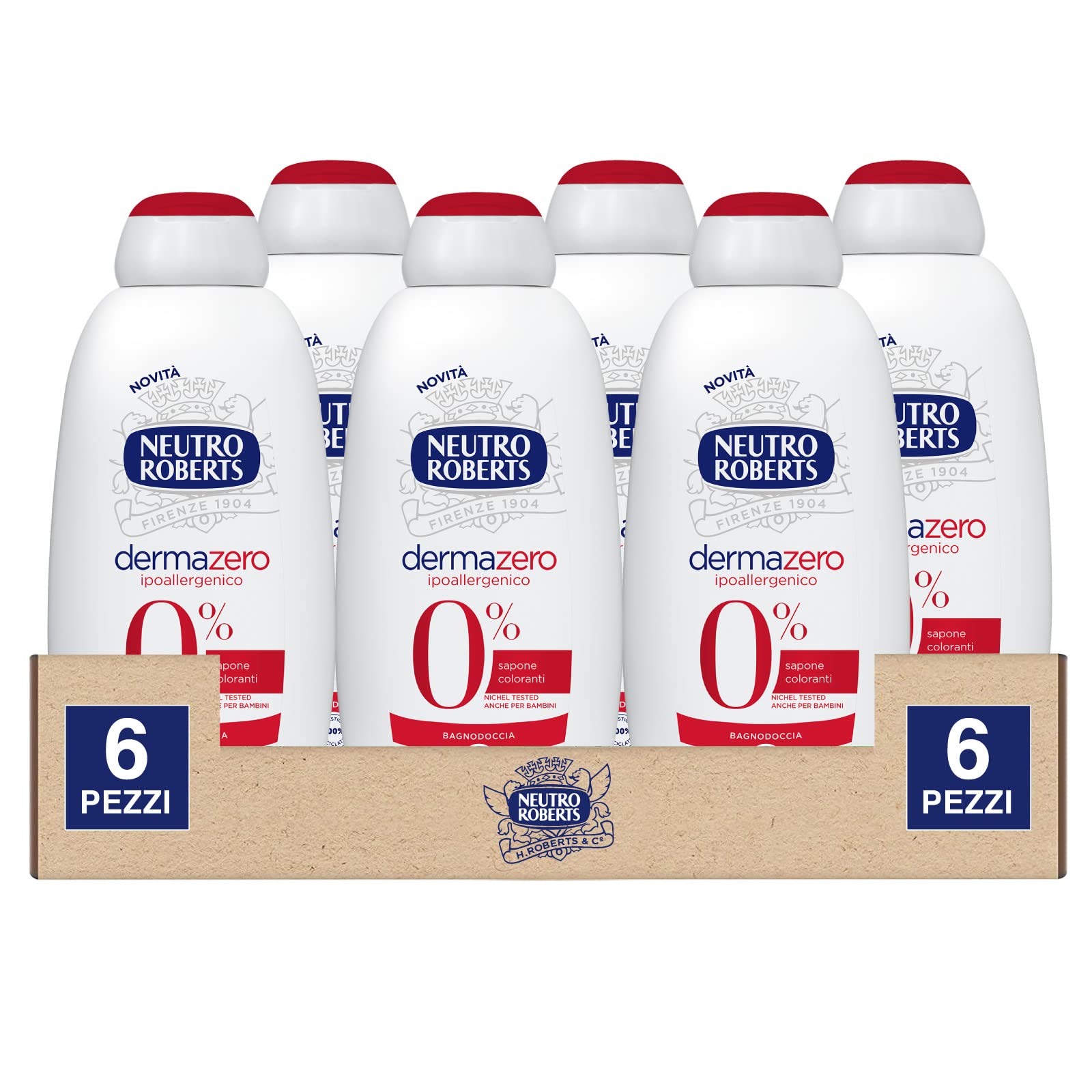 Neutro Roberts Bain de douche Dermazero hypoallergénique sans savon et colorants pour peaux délicates et sensibles PH physiologique indiqué pour enfants – 6 flacons de 600 ml