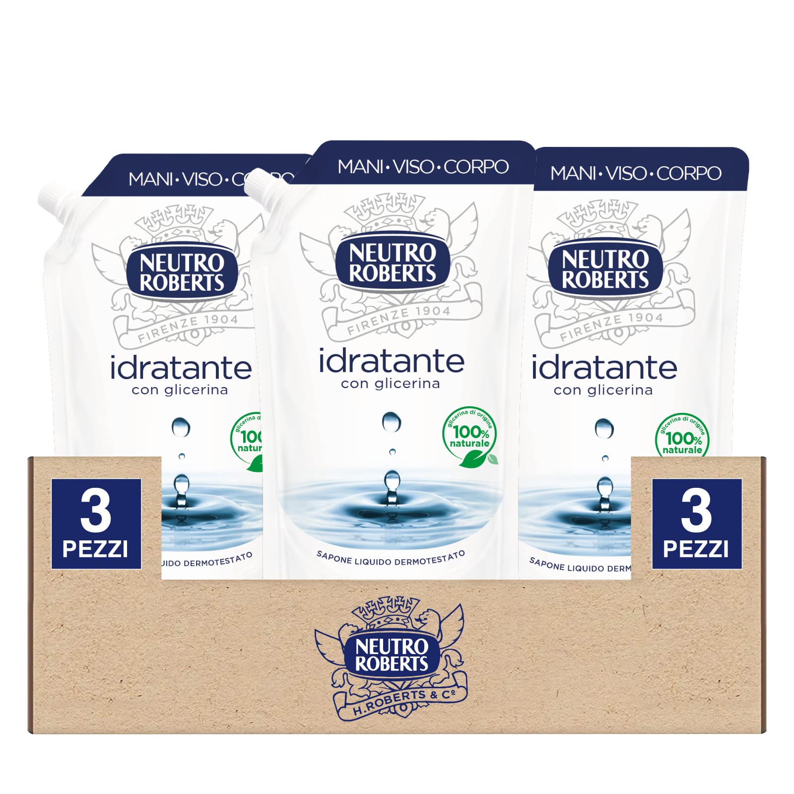Neutro Roberts Ecopouch Recharge Savon Liquide Hydratant pour Mains Visage et Corps Écoricharge avec 100 Glycérine Naturelle pour Peau Douce et Saine Testé dermatologiquement - 3 flacons de 400 ml Recharge de savon liquide hydratant 400 ml (Confezione da 3)
