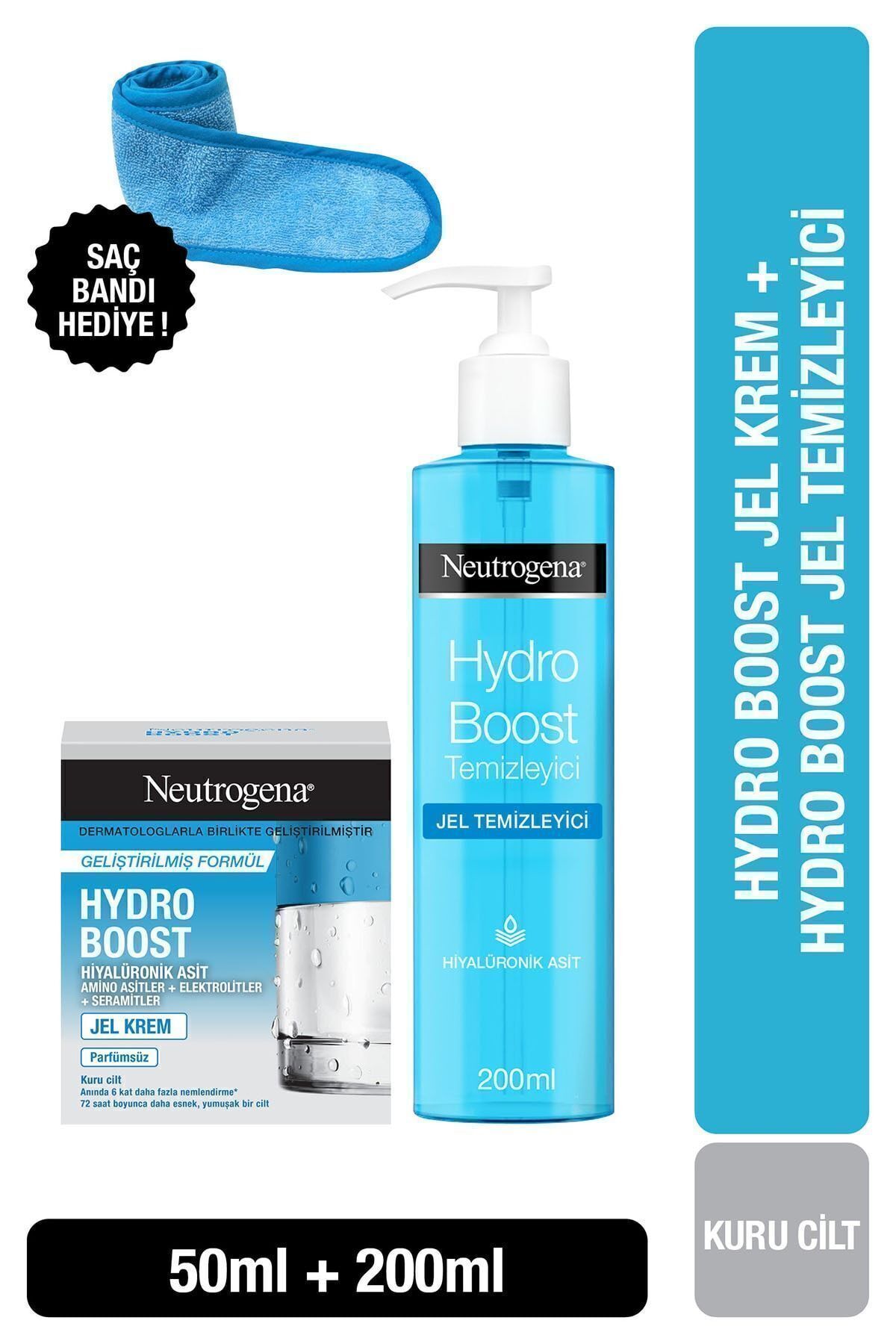 Neutrogena Hydro Boost Water Gel Cleanser + Moisturizer for Dry Skin + Hair Band.