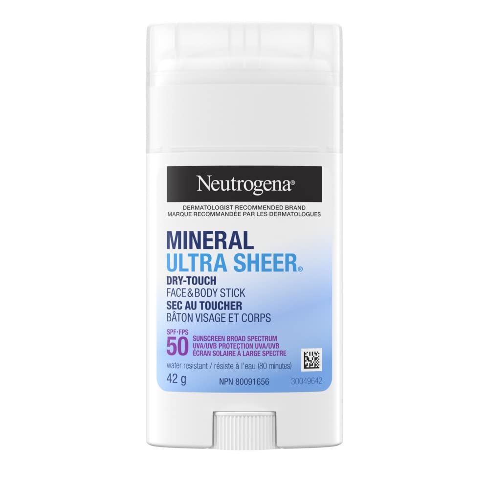 Neutrogena Mineral Ultra Sheer Dry-Touch Face Body Stick SPF 50 helps protect your skin against sun damage and helps reduce the risk of early signs of skin aging caused by the sun when used as directed with other sun protection measures. This sheer mineral sunscreen stick contains 21.6 zinc oxide mineral sunscreen providing broad spectrum UVA UVB protection and is formulated with vitamin E. The sunscreen stick leaves a dry-touch finish with no white residue and leaves skin feeling soft, smooth, and moisturized. This dry-touch stick sunscreen is water resistant for up to 80 minutes and won't run into the eyes and sting. When used as directed with other sun protection measures, this face and body stick sunscreen helps to decrease the risk of skin cancer and early skin aging caused by the sun. Apply liberally 15 minutes before sun exposure and reapply at least every 2 hours or after 80 minutes of swimming or sweating and right after towel drying. Each package comes with one 42-gram stick of Mineral Ultra Sheer Dry-Touch Face Body Stick with SPF 50 for broad spectrum UVA UVB protection. This moisturizing sunscreen stick from a dermatologist recommended brand helps protect your skin against harmful UVA UVB rays.This moisturizing sunscreen stick from a dermatologist recommended brand helps protect your skin against harmful UVA UVB rays. Apply liberally 15 minutes before sun exposure and reapply at least every 2 hours or after 80 minutes of swimming or sweating and right after towel drying. This dry-touch stick sunscreen is water resistant for up to 80 minutes and won't run into the eyes and sting. This sheer mineral sunscreen stick contains 21.6 zinc oxide mineral sunscreen providing broad spectrum UVA UVB protection and is formulated with vitamin E. This sheer mineral sunscreen stick helps reduce the risk of early signs of skin aging caused by the sun when used as directed with other sun protection measures. The sunscreen stick leaves a dry-touch finish with no white residue and leaves skin feeling soft, smooth, and moisturized. When used as directed with other sun protection measures, this face and body stick sunscreen helps to decrease the risk of skin cancer and early skin aging caused by the sun. Neutrogena Mineral Ultra Sheer Dry-Touch Face Body Stick SPF 50 helps reduce the risk of early signs of skin aging caused by the sun when used as directed with other sun protection measures. Each package comes with one 42-gram stick of sheer mineral sunscreen with SPF 50 for broad spectrum UVA UVB protection.