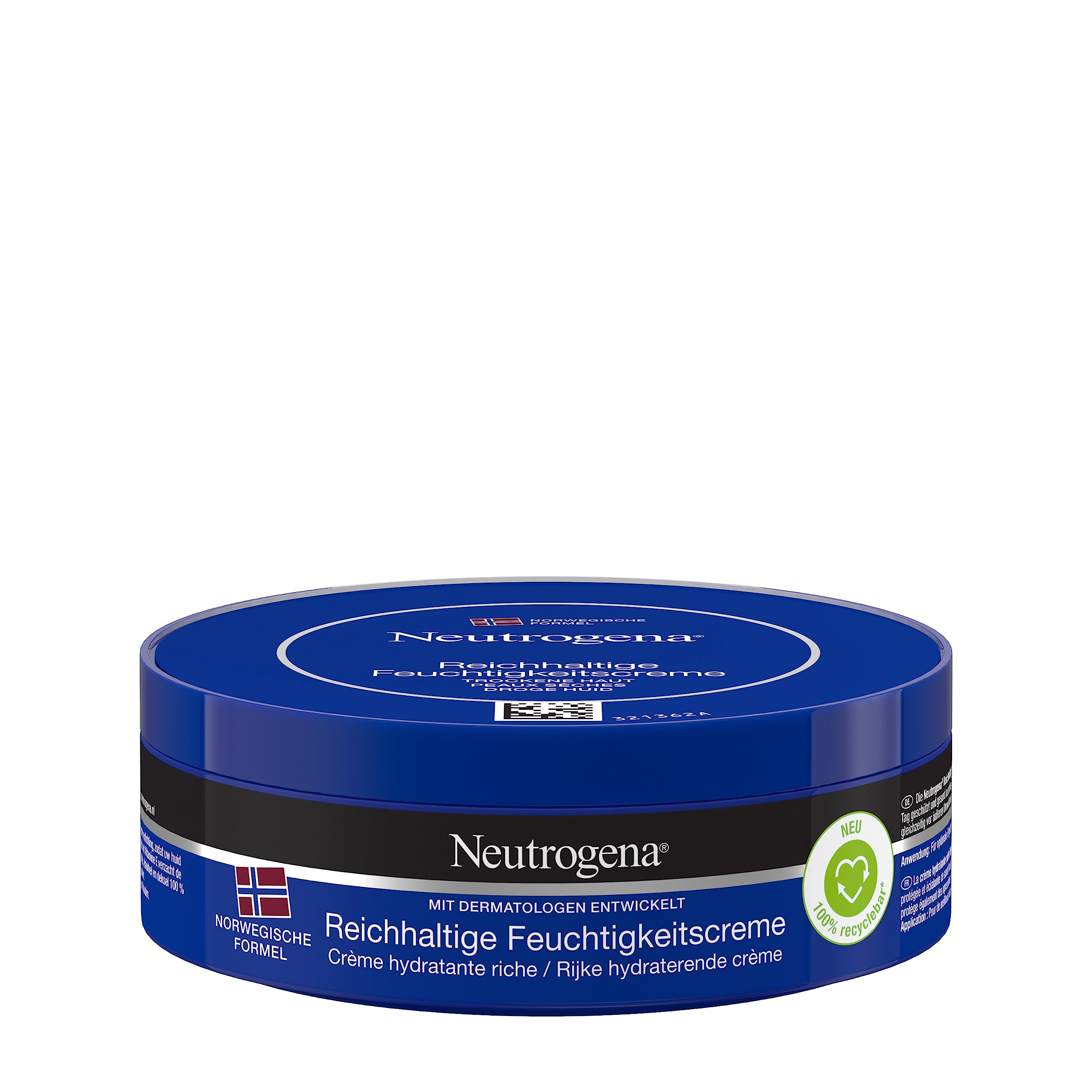 Neutrogena Rich Moisturizing Cream for dry skin, with its Norwegian formula, intensely nourishes for immediate relaxation and leaves skin feeling protected and healthy all day long. This skincare cream, enriched with vitamin E, has been proven to instantly soothe very dry skin while protecting against external aggressors. This cream, suitable for the body, face, and hands, was developed with dermatologists, and the jar, protective film, and lid are 100 recyclable. Please separate the jar, protective film, and lid before disposal. Directions: Apply daily to the entire body, face, and hands for optimal results. INGREDIENTS Aqua, Glycerin, Paraffinum Liquidum, Petrolatum, Isopropyl Palmitate, Stearyl Alcohol, Dimethicone, Glyceryl Stearate, PEG-100 Stearate, Synthetic Beeswax, Tocopheryl Acetate, Panthenol, Allantoin, Ethylhexylglycerin, Stearic Acid, Palmitic Acid, Ammonium Acryloyldimet. hyltaurate VP Copolymer, Acrylates C10-30 Alkyl Acrylate Crosspolymer, Disodium EDTA, Citric Acid, Sodium Hydroxide, Tocopherol, Phenoxyethanol, Parfum [PR-015162]Contents: 1 x 200 ml Neutrogena Norwegian Formula Rich Moisturizing Cream, Body, Face Hand Care for Dry Skin. For body, hands, and face: This rich care cream for dry skin is suitable for the body, hands, and face, ensuring protected and healthy skin throughout the day. The jar, protective film, and lid are 100 recyclable. The cream, as a body, face, and hand cream, was developed with dermatologists, and the jar, protective film, and lid are 100 recyclable. Please separate the container, protective film, and lid before disposal. Norwegian formula enriched with vitamin E: This skin care cream is enriched with vitamin E and has been proven to immediately soothe very dry skin while protecting against external environmental aggressors. Cream for dry skin: Neutrogena's rich moisturizing cream for dry skin, with its Norwegian formula, offers intense moisturizing care for immediate skin relaxation, leaving it protected and healthy all day long.Neutrogena Formule norvégienne crème hydratante riche (200 ml), crème de soin intense pour peaux sèches avec vitamine EDESCRIPTION DU PRODUIT DESCRIPTION DU PRODUIT La crème hydratante riche Neutrogena pour peaux sèches avec sa formule norvégienne nourrit intensément pour une relaxation immédiate et laisse la peau protégée et saine tout au long de la journée. Il a été prouvé que la crème de soin de la peau enrichie en vitamine E apaise immédiatement les peaux très sèches tout en protégeant contre les agressions extérieures. La crème comme crème pour le corps, crème pour le visage et les mains a été développée avec des dermatologues et le pot, le film de protection et le couvercle sont 100 recyclables. Veuillez séparer le pot, le film de protection et le couvercle avant de le jeter. Utilisation : appliquer quotidiennement sur tout le corps, le visage et les mains pour des résultats optimaux. INGRÉDIENTS Aqua, Glycerin, Paraffinum Liquidum, Petrolatum, Isopropyl Palmitate, Stearyl Alcohol, Dimethicone, Glyceryl Stearate, PEG-100 Stearate, Synthetic Beeswax, Tocopheryl Acetate, Panthenol, Allantoin, Ethylhexylglycerin, Stearic Acid, Palmitic Acid, Ammonium Acryloyldimet. hyltaurate VP Copolymer, Acrylates C10-30 Alkyl Acrylate Crosspolymer, Disodium EDTA, Citric Acid, Sodium Hydroxide, Tocopherol, Phenoxyethanol, Parfum [PR-015162]Contenu de la livraison : 1 x 200 ml de formule norvégienne Neutrogena riche crème hydratante, soin du corps, soin du visage et des mains pour peaux sèches. Pour le corps, les mains et le visage : la crème de soin riche pour peaux sèches convient au corps, aux mains et au visage et assure une peau protégée et saine tout au long de la journée. Le pot, le film de protection et le couvercle sont 100 recyclables – La crème comme crème pour le corps, crème pour le visage et les mains a été développée avec des dermatologues et le pot, le film de protection et le couvercle sont 100 recyclables. Veuillez séparer le récipient, le film de protection et le couvercle avant de le jeter. Formule norvégienne enrichie en vitamine E - La crème de soin de la peau est enrichie en vitamine E et a prouvé qu'elle apaise immédiatement les peaux très sèches tout en protégeant contre les agressions extérieures de l'environnement. Crème pour peaux sèches : la crème hydratante riche Neutrogena pour peaux sèches avec sa formule norvégienne offre un soin hydratant intense pour une détente immédiate de la peau et la rend protégée et saine tout au long de la journée.