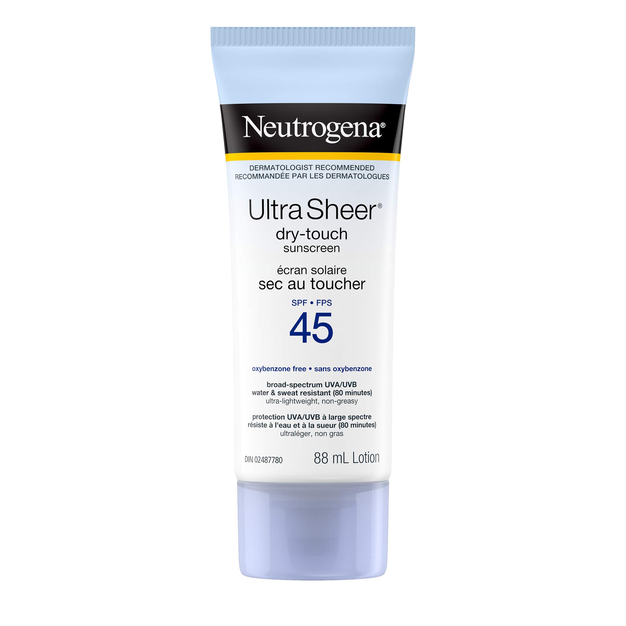 Get effective sun protection without the heavy finish with Neutrogena ultra sheer Dry-Touch sunscreen. This broad spectrum SPF 45 sunscreen lotion with Dry-Touch technology absorbs fast for a clean, ultra-light feel and shine-free finish. This sunscreen offers effective broad spectrum protection from aging UVA rays and burning UVB rays. Fast-absorbing and water-resistant, this non-greasy formula is non-comedogenic, PABA-free and oxybenzone-free.This oxybenzone-free and dermatologist tested formula is non-comedogenic, so it won't clog pores. Dry-touch technology absorbs fast for an ultra-light, shine-free finish. Provides effective sun protection against UVA and UVB rays. This Neutrogena ultra sheer Dry-Touch sunscreen lotion goes on easily and absorbs quickly for an invisible, non-greasy feel. Water-resistant sunscreen lotion with broad spectrum SPF 45.