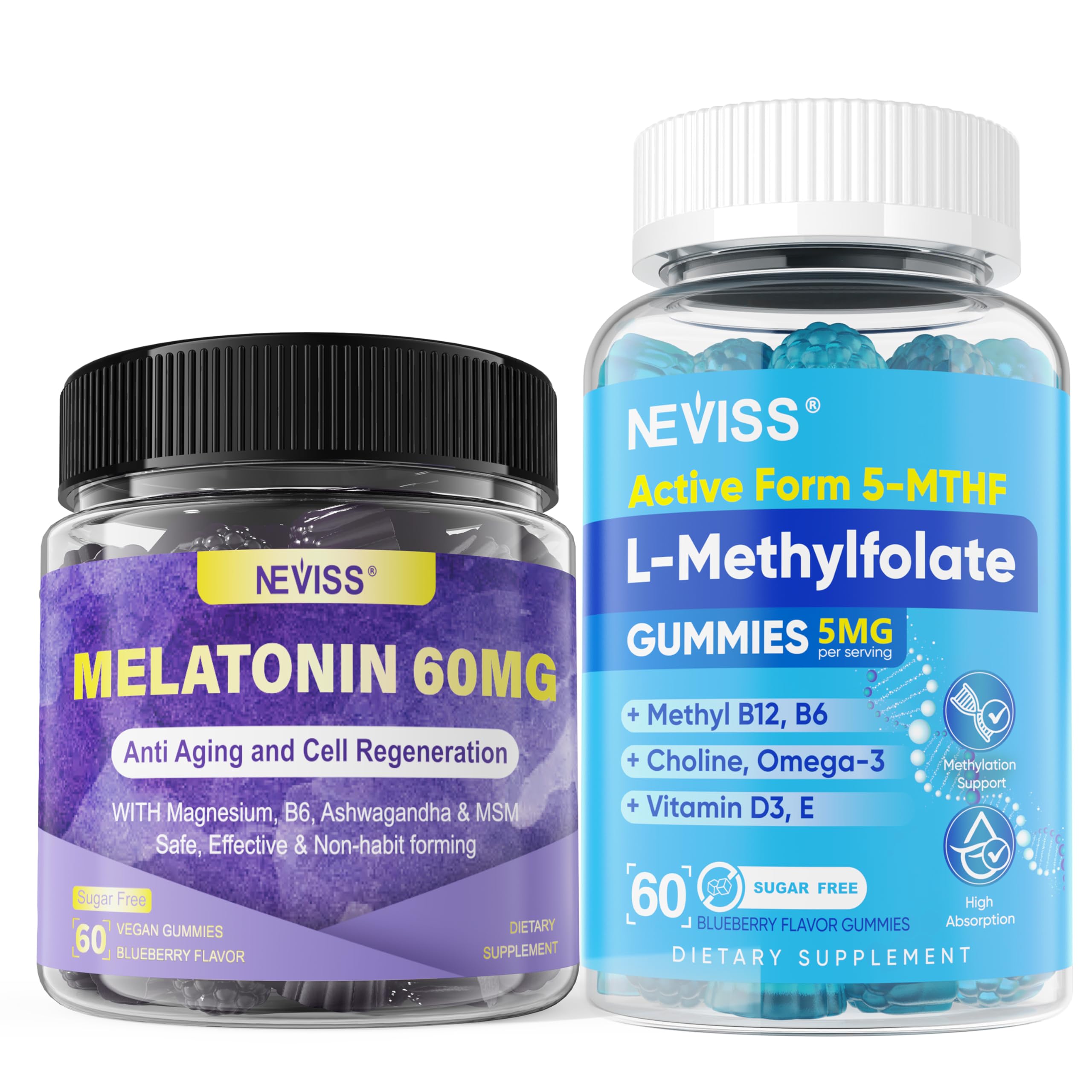 Our dual-action gummies combine 60mg Melatonin with powerful brain and body nutrients like L-methylfolate (5mg), MSM, Vitamin B6, Ashwagandha, and vegan Omega-3s. This advanced blend promotes restful sleep, mental clarity, mood balance, and antioxidant protection—while supporting folate metabolism, immune health, and overall vitality. Made in the USA with clean, sugar-free ingredients.Safe and Reliable: Manufactured in a GMP-certified facility in the USA, they adhere to strict manufacturing standards and are rigorously tested to ensure quality, potency, and safety. Our gummies are non-GMO, vegetarian-friendly, gluten-free, low-calorie, and naturally flavored. [Methylated B Vitamins That Support Folate Metabolism] Methylcobalamin B12 and Pyridoxal-5-Phosphate (B6) are essential partners in folate metabolism. Methyl B12 helps convert homocysteine into methionine, while B6 supports critical enzyme activity in this pathway. Working together, they help boost energy and promote mood balance. Without these cofactors, methylfolate alone cannot effectively support methylation or maintain healthy homocysteine levels. Strong Antioxidant Properties: Combining high-dose Melatonin with MSM, these gummies offer superior antioxidant protection. This powerful formulation effectively neutralizes oxidative stress, supporting cellular health and preserving youthful energy for a vibrant, resilient body. [Active Folate for MTHFR Support] We use L-methylfolate—the active form your body absorbs and uses directly, without conversion. This is especially important for those with MTHFR variants, increased folate requirements, or difficulty processing folate, where folic acid may be less effective. Each serving delivers a high-strength 5 mg dose (2.5 mg per gummy), offering more reliable folate support, more noticeable effects, and potentially safer long-term benefits than lower doses like 1 mg or 2 mg. Designed for 50 Adults: Our 60mg Melatonin gummies are expertly crafted for adults aged 50 and over. Enhanced with Vitamin B6 and MSM, this sophisticated blend supports anti-aging benefits, cognitive clarity, and overall vitality, promoting a balanced sense of well-being that addresses the unique needs of mature adults.