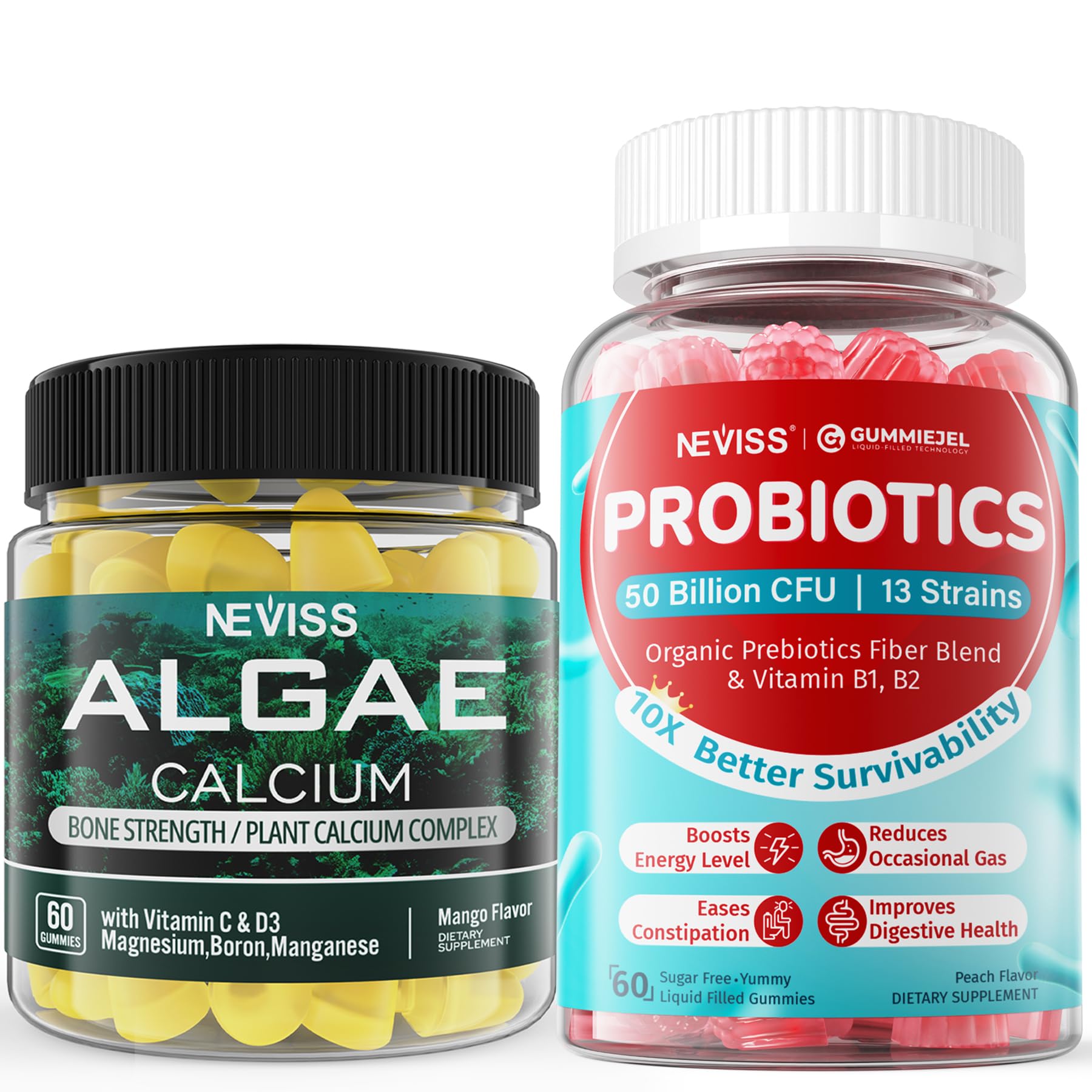 NEVISS Algae Calcium Gummies 600mg + Sugar Free Probiotics Gummies